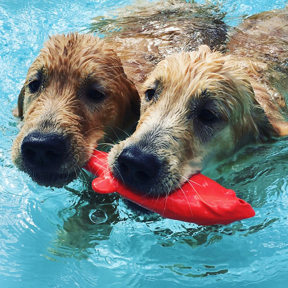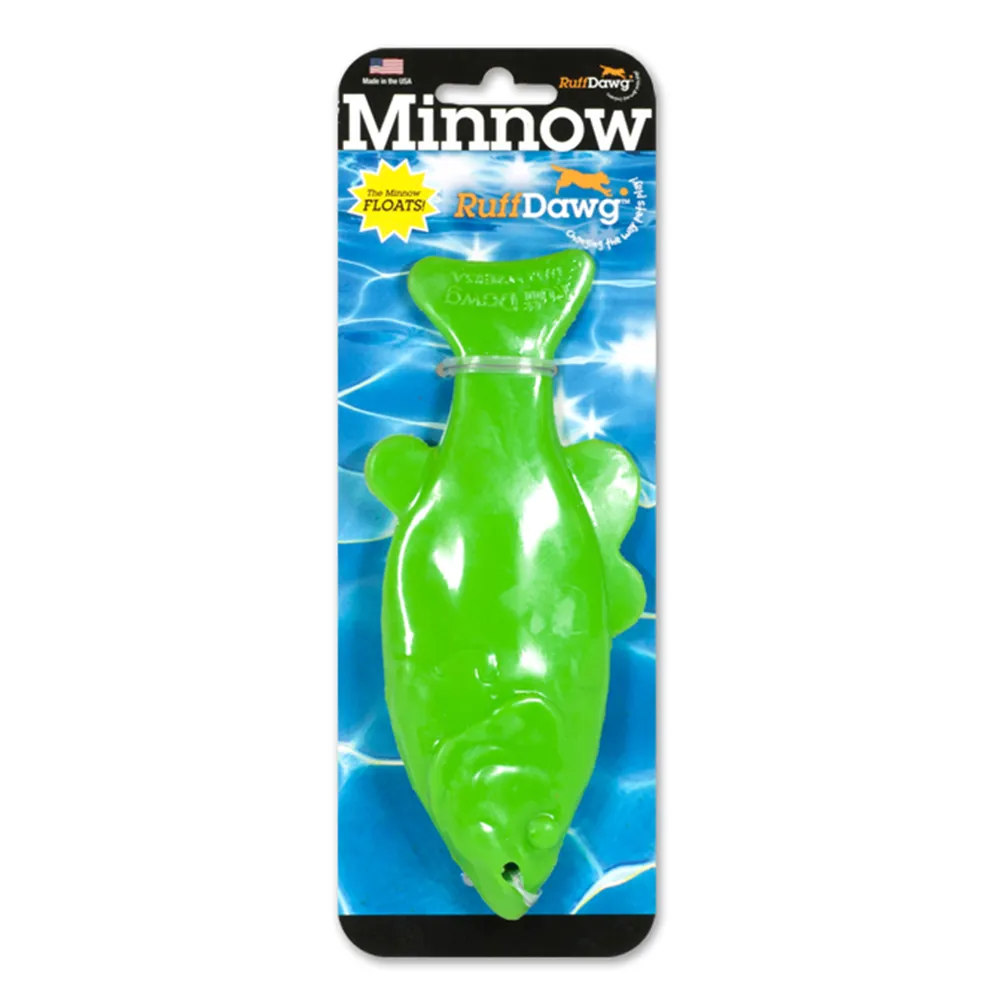 The RuffDawg™ Minnow Toy is made of durable rubber for play in or out of the water. It is scented and has bright neon colors. The RuffDawg™ Minnow Toy can be strung on a rope for tugging with your pet.