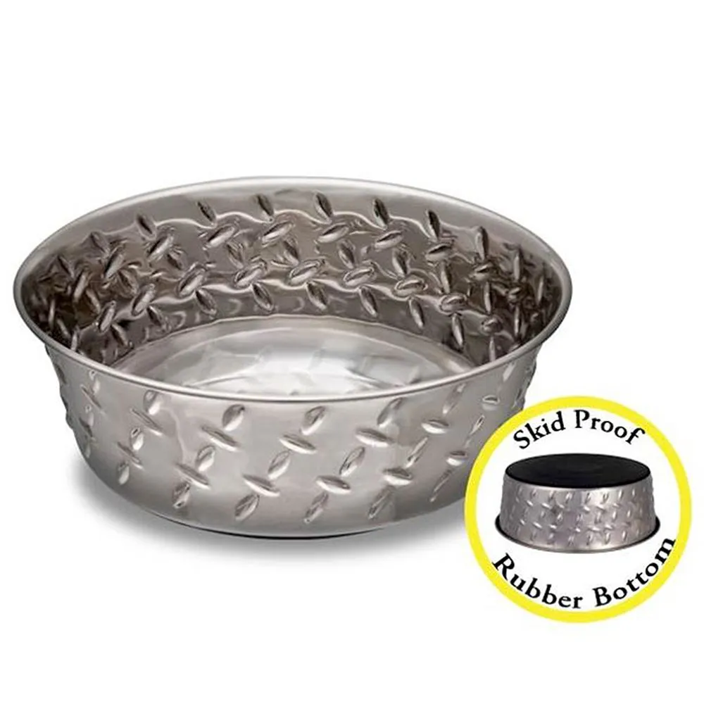 Constructed from stainless steel this pet bowl features a skip-proof rubber bottom and the side walls are stamped with a diamond plate design.