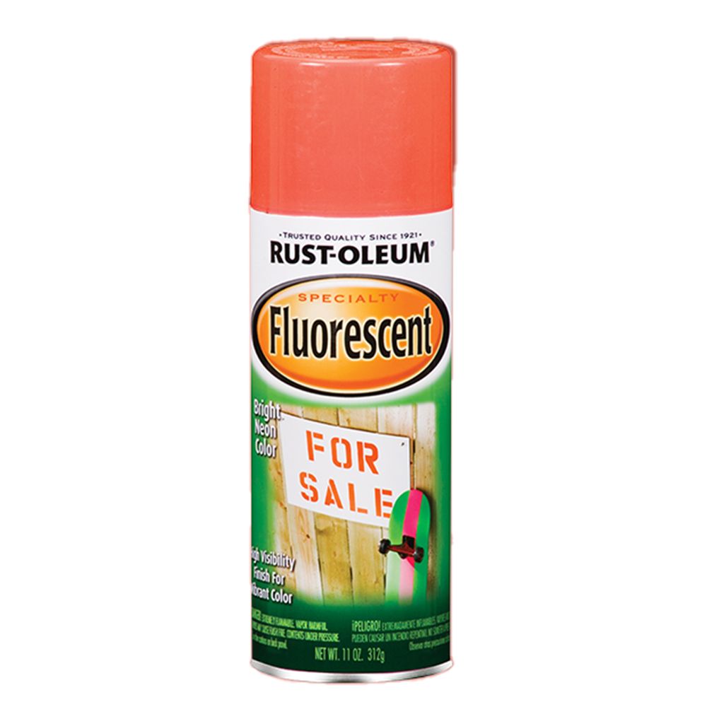 Rust-Oleum® Specialty Fluorescent Spray adds vibrant color to crafts, toys, sporting goods, and more. Apply to any surface. Creates high visibility when stenciled or sprayed directly on objects.