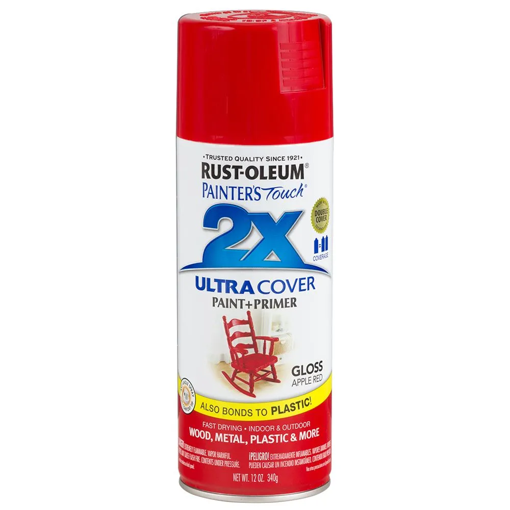 This general-purpose Rust-Oleum 2X Gloss Apple Red spray has ultimate coverage. It can be applied to wood, plastic, metal and much more. This 12 ounce can be sprayed at any angle for those hard to reach places. Featuring a comfort tip helps eliminate finger fatigue for large projects. Fast-drying.