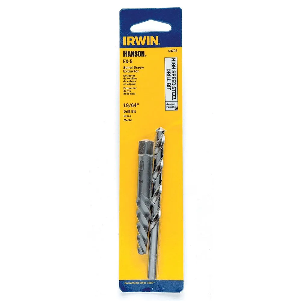 This spiral screw extractor and bit set are designed to remove broken studs, bolts, socket screws, and fittings. The extractor removes bolts and screws 3/8" - 5/8", 1/4" NPT, 1/4" BSP, 10 mm - 16 mm.