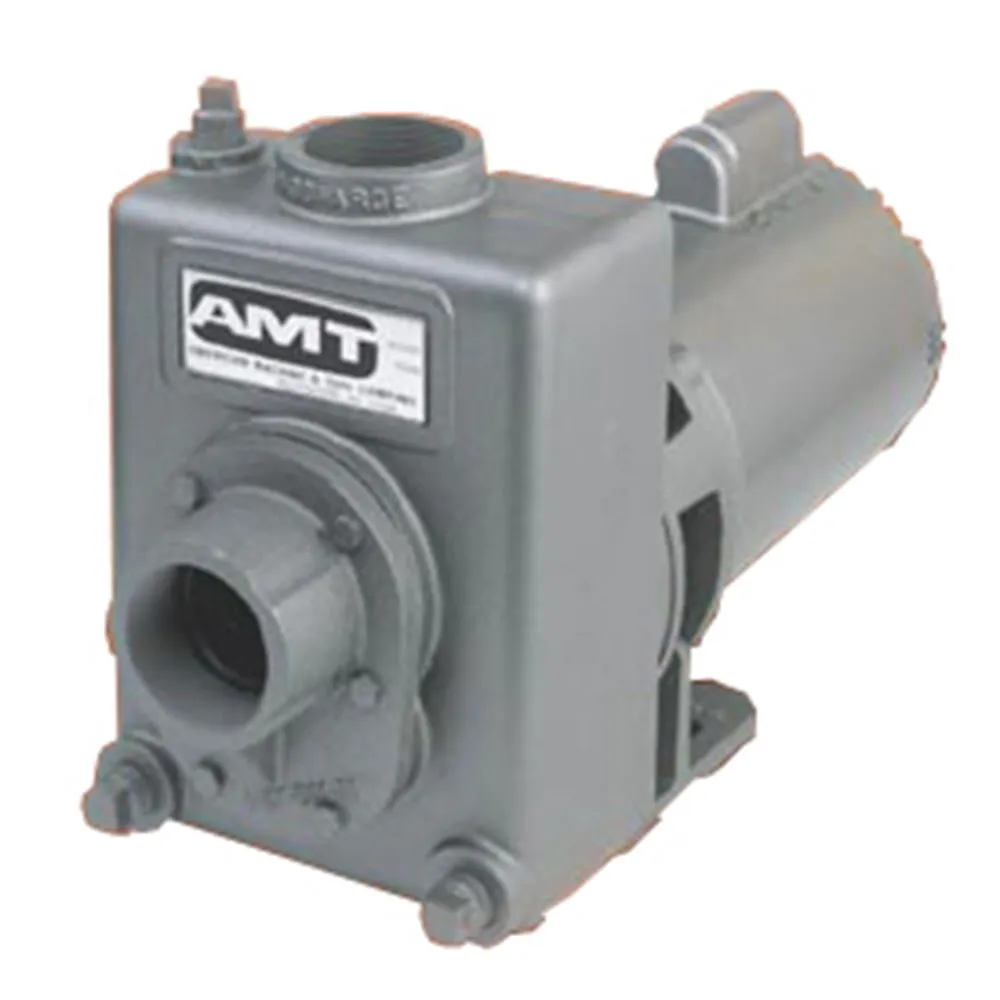 2 HP - 2" Self Priming Cast Iron Centrifugal Pump, This line of AMT Self-priming Centrifugal pumps is designed for Industrial and Commercial applications requiring high volume liquid transfer, waste water drainage and processing. AMT Centrifugal pumps are reliable, cost effective and low maintenance. This pump features self-cleaning clog resistant cast iron impeller capable of handling up to 3/8" diameter semi-solids. Built in Flapper/Check valves enable consistant self-priming to 20 feet. It comes with mechanical buna-n seals. The maximum temperature is 180 degrees; the maximum head is 102 feet. The maximum flow @ 10' head is 150 GPM. The maximum working pressure is 100 PSI.