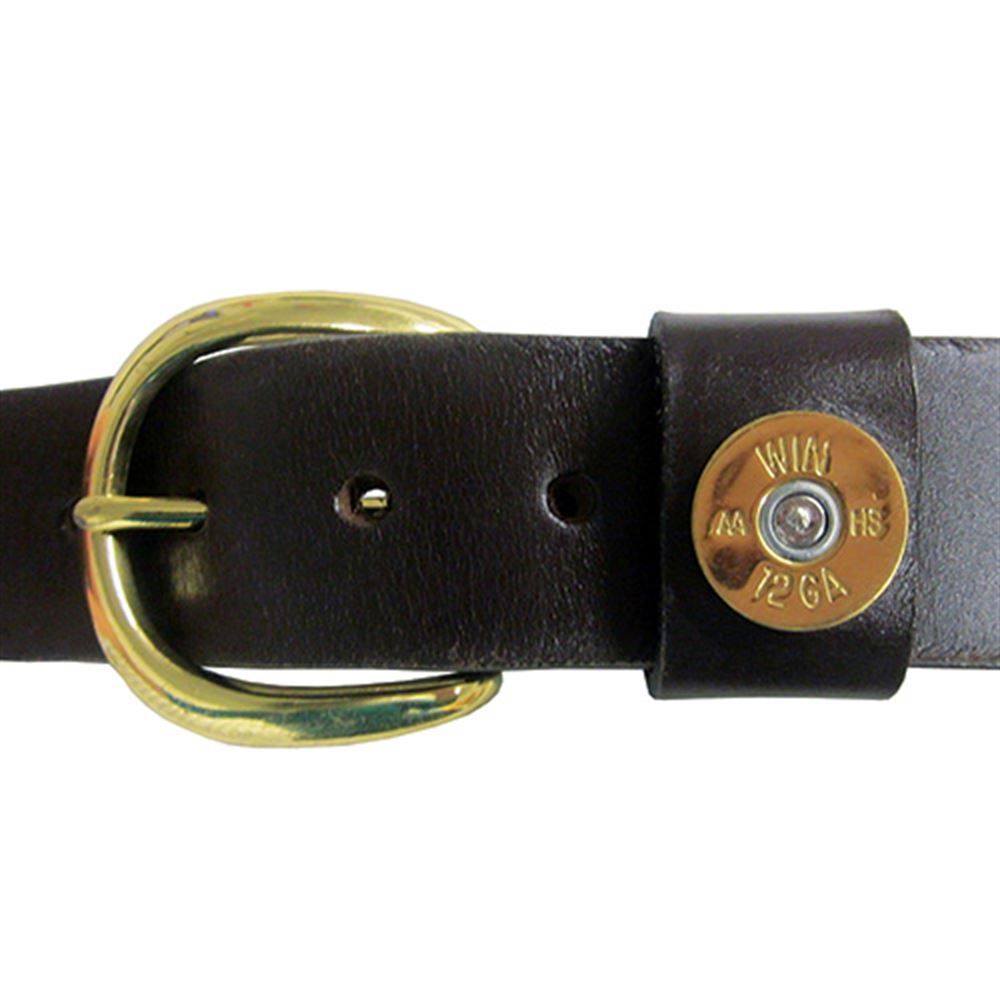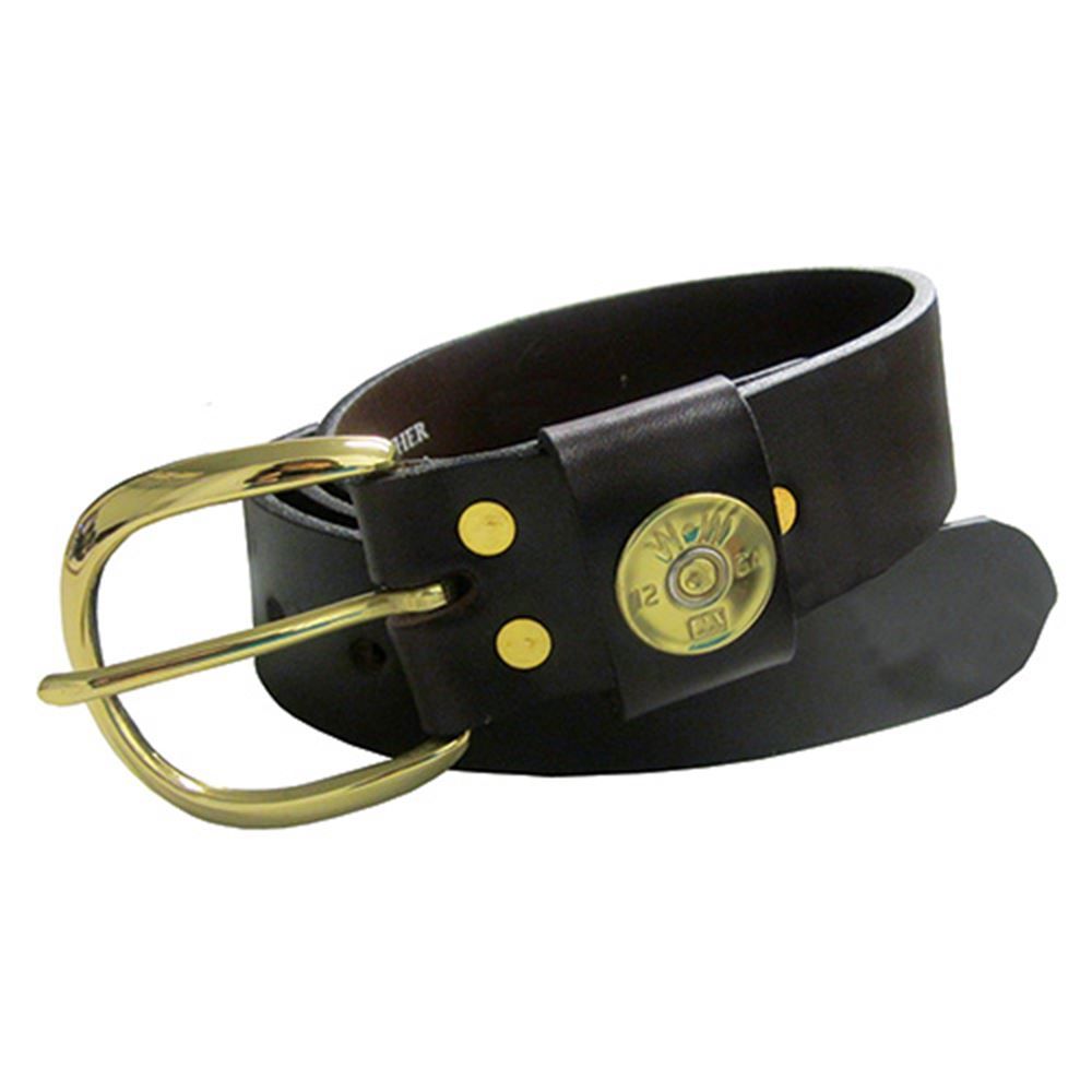 This leather belt, measuring only 1-1/2 in. wide, is constructed from genuine leather without fillers or liners. It includes a brass buckle and a matching polished shotgun shell on the keeper.