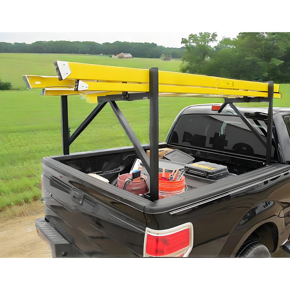 Designed to fit most truck bed rails, this side mount ladder can support up to 250 lbs. Each ladder rack measures 35 inches tall, has 1 support foot that measures 16 inches long, and the width on both adjusts from 19 to 34 inches. The frames are constructed from square steel that measures 1-1/2 inches in diameter. There is one removable support arm for additional security, and all hardware is included. Overall this pickup truck ladder rack has a powder coated finish to protect against abrasions and harsh weather conditions.