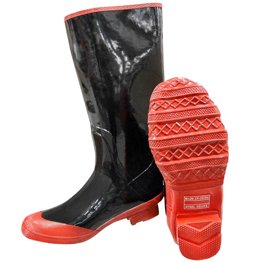 These rain boots are a perfect height for walking through the rain or wet areas. The bottoms have heavy duty lug treads for excellent traction and have comfortable insoles. The exterior is a shiny PVC material, and this pair is a size 11, with other sizes available.