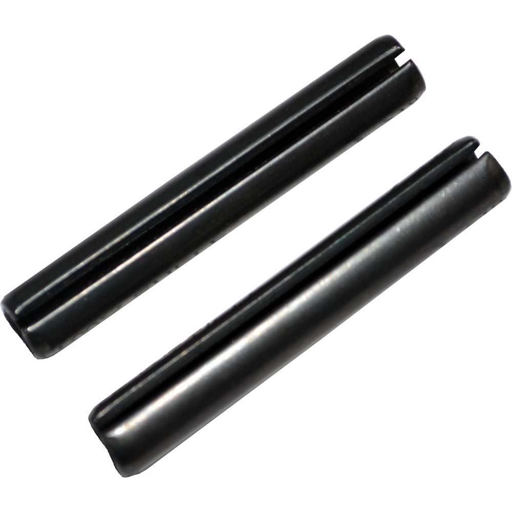 This cylindrical shaped coil spring pin has a hollowed interior and a slotted design. The slot offers benefits that include anchoring clips, cupping objects, and allowing a distribution of weight around the spring pin. Measuring 2 in. length x 5/16 in. diameter, this spring pin is constructed from high carbon steel and has a plain finish. The chamfered ends create an easy installation as they fit well into tight spaces. There are 2 slotted spring pins sold in this set, and these powerful hardware pieces have a double shear strength minimum of 10,800 lbs.
