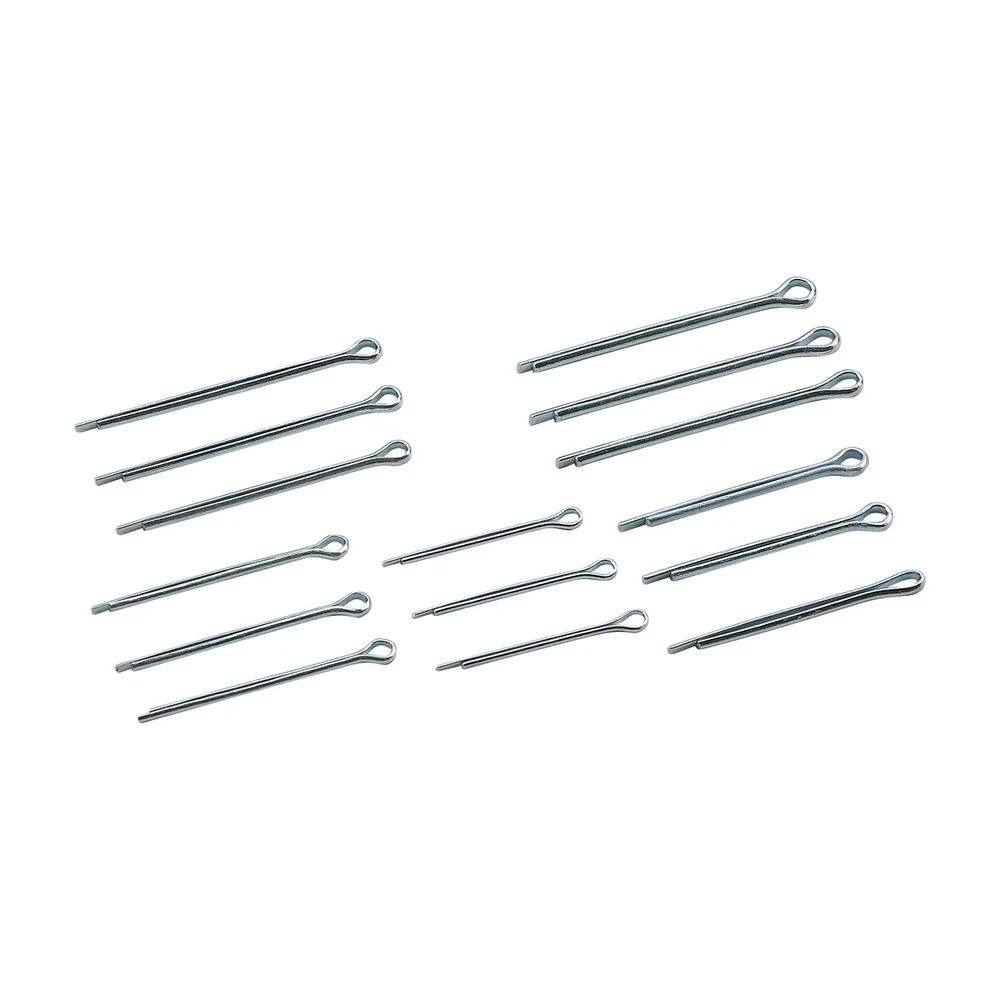 An assortment of two-pronged cotter pins in various sizes. Prongs will separate when installed. For locking pins or castle nuts in place. Easy to use in diverse applications.
