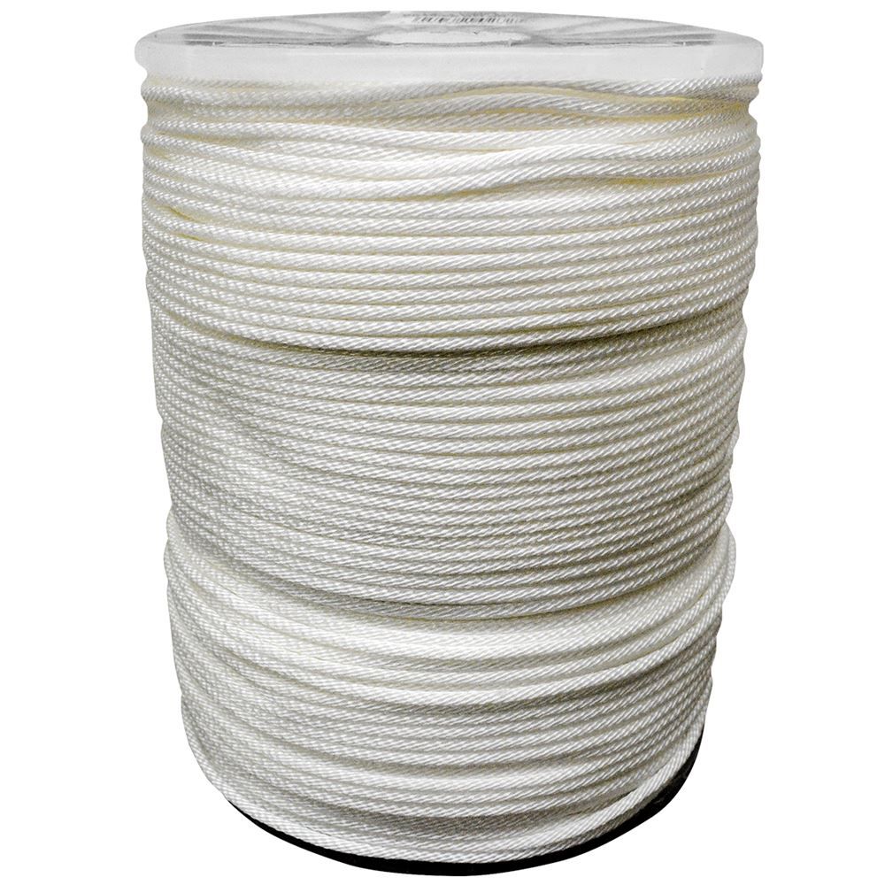 This solid braided rope is constructed from nylon. This rope is soft and pliable, great for a variety of home and shop uses. The diameter of this poly rope measures 1/8 inch, and it is sold by the foot.
