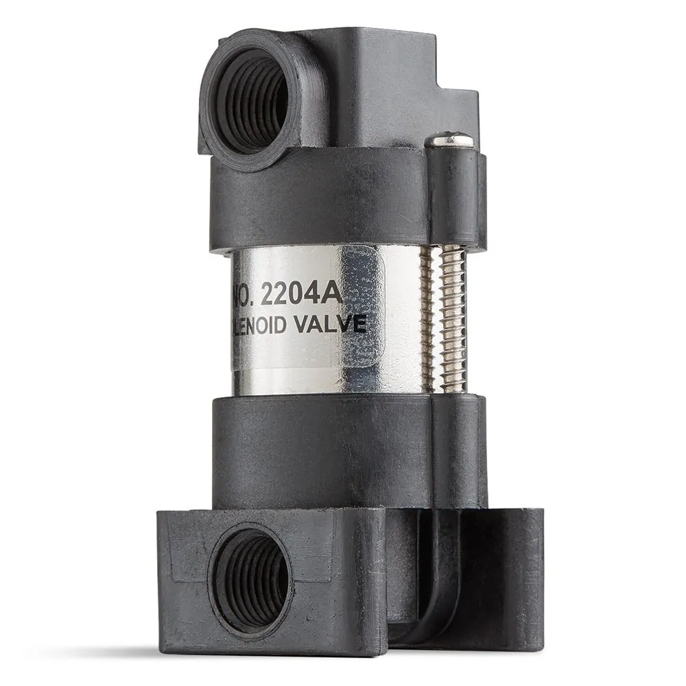 3-Way Solenoid Valve, The 2204A is used for foam and flow direction. The valve is a 3-Way 12-Volt DC solenoid valve with 1/4" male spade terminals. The valve has a 1/4" NPT female inlet and two 1/4" NPT female outlets. The valve housing is made of glass filled nylon and the wetted metal parts of 304 and 430 stainless steel. The Viton seals and "O" rings are standard. The coil is totally epoxy encapsulated. The valve is ideal for foam markers to control both air and liquids. The valve has a .105 Diameter Orifice, .22 CV Rating, 1/2 GPM, 55 PSI, 12-Volt DC, rated at .85 Amp.