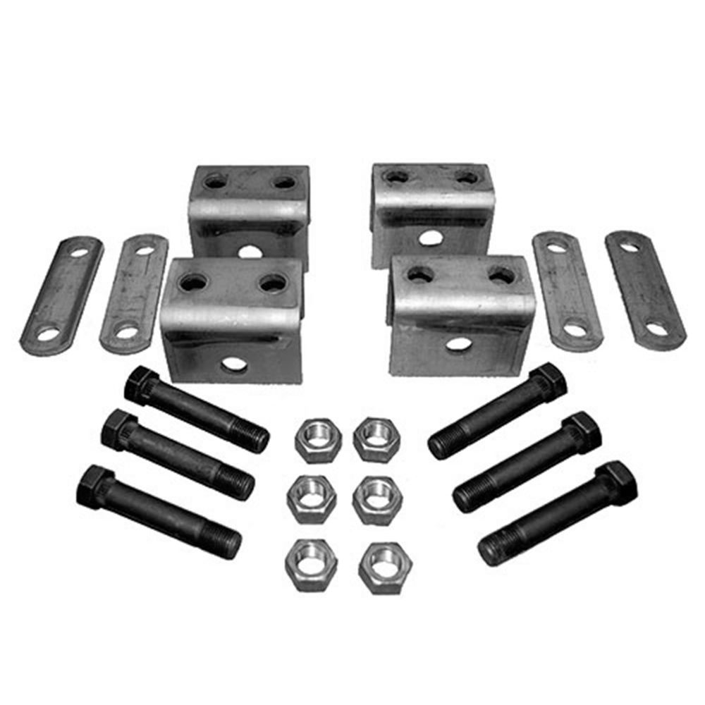 - Kit includes: (2) brackets, (2) front/rear brackets, (4) shackle links, (6) bolts, (6) locknuts