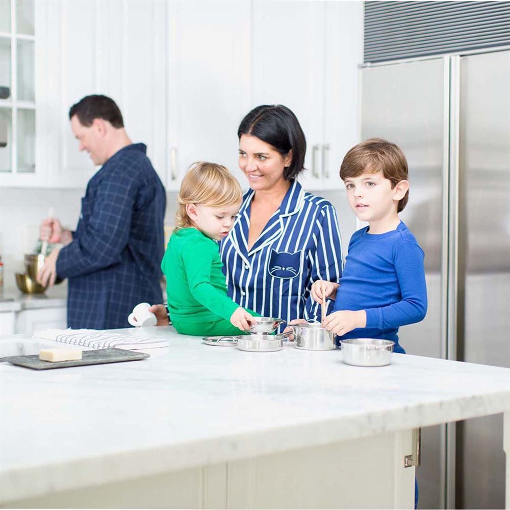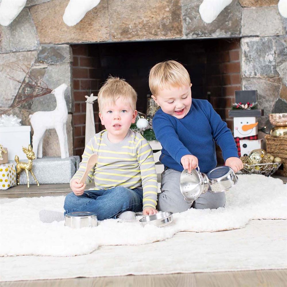 This stainless steel pots and pans playset includes a colander, pot with lid, 2 pans, 2 wooden utensils, and rack. It is hand-polished stainless steel with sturdy handles with riveted construction.