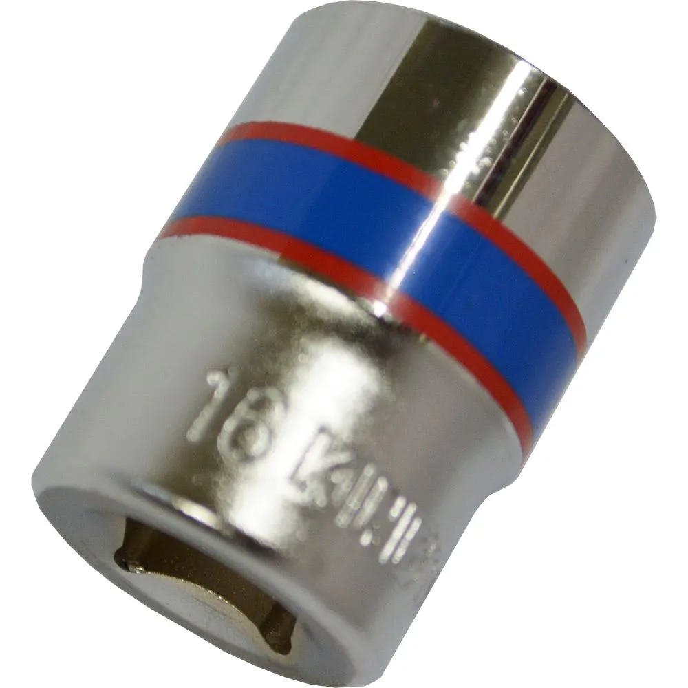 A standard socket is a very useful tool to have to make sure bolts or other fastener applications are tightened correctly. This standard socket measures 16M with a 3/8 in. drive and is durable due to its chrome vanadium alloy steel construction.