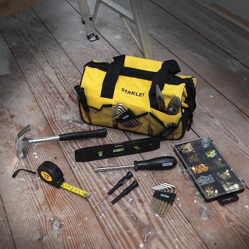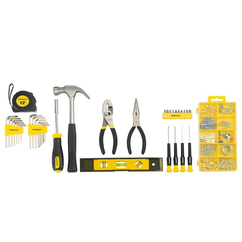 • Includes; 12 ft. measuring tape, 7 oz. hammer, 6" long nose pliers, 6" slip joint pliers, 4 mini screwdrivers, 1/4" drive spinner handle, 10 1/4" drive specialty bits, torpedo level, full picture hanging kit, 8 SAE hex keys, 8 mm hex keys, durable tote carrying case.