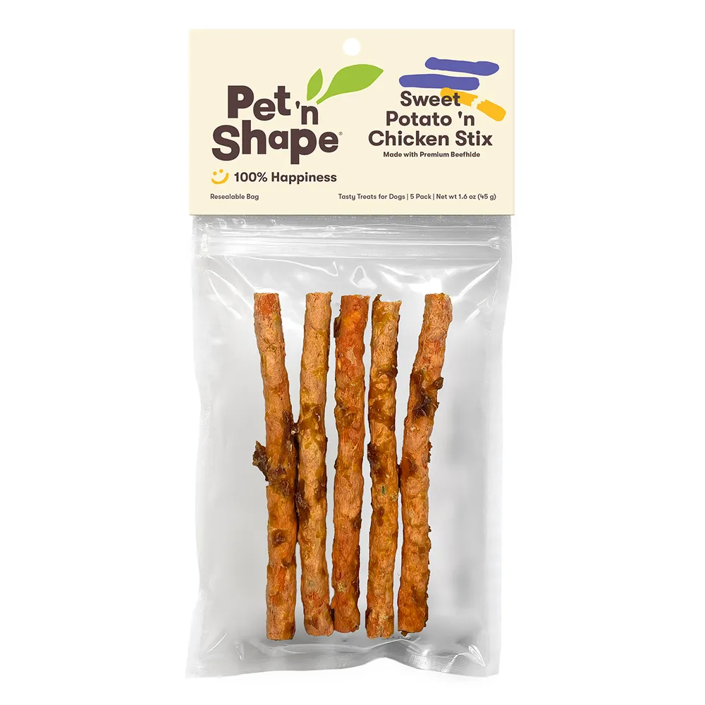 The combination of sweet potato, chicken and beef hide in Pet'n® Sweet Potato & Chik'n Stix is rich in vitamins and helps promote coat health and good vision. Great for all breeds of dogs.