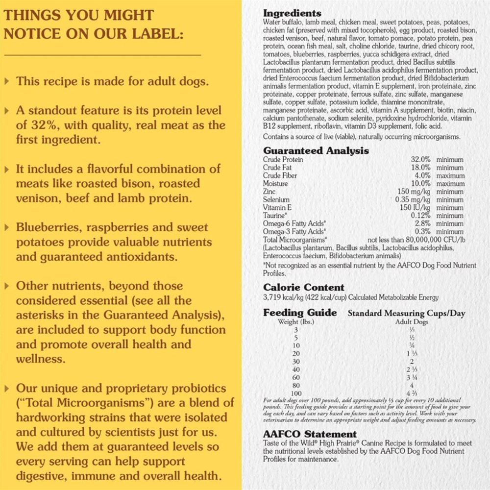 Taste of the Wild High Prairie Canine Recipe is formulated to meet the nutritional levels established by the AAFCO Dog Food Nutrient Profiles for maintenance.