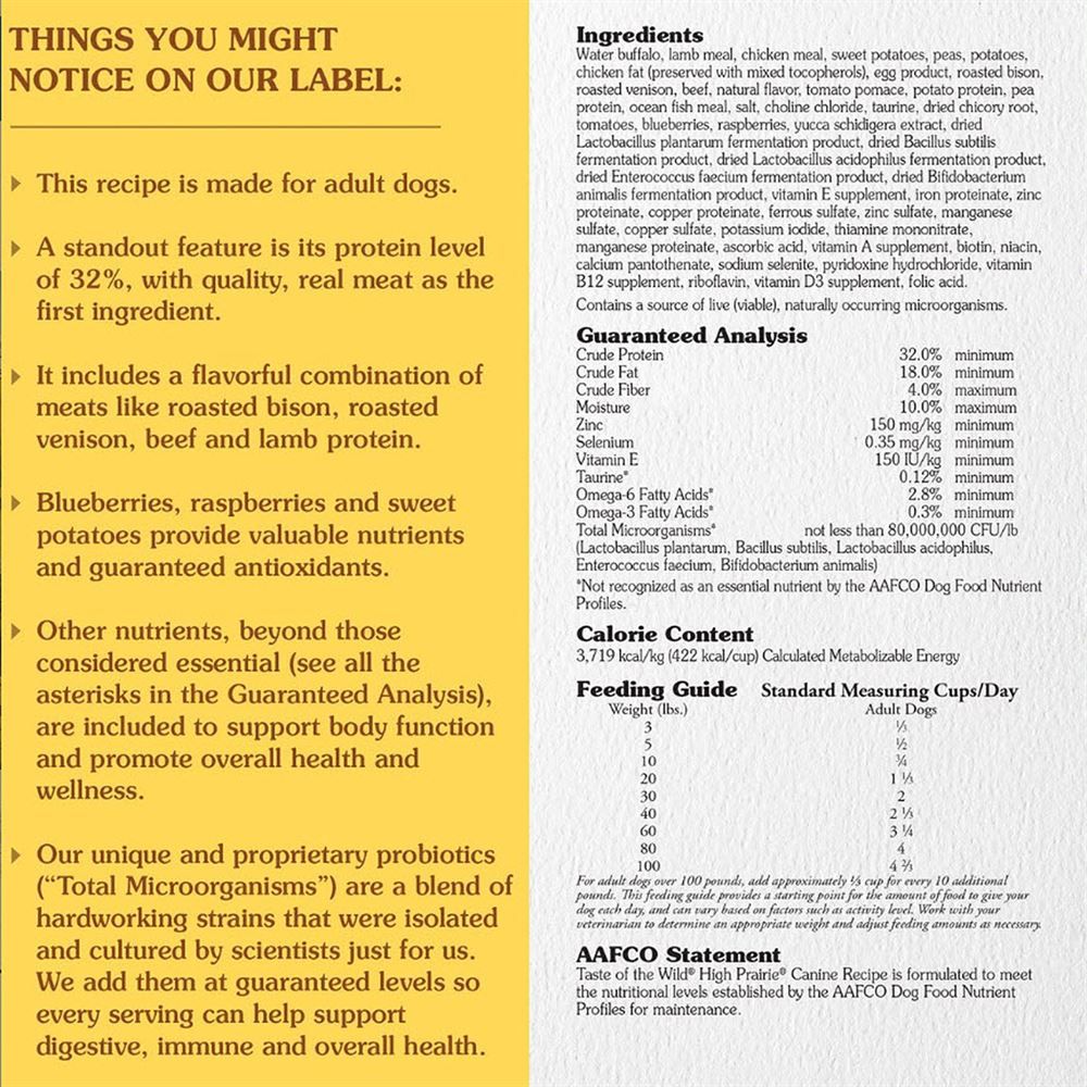 Taste of the Wild High Prairie Canine Recipe is formulated to meet the nutritional levels established by the AAFCO Dog Food Nutrient Profiles for maintenance.