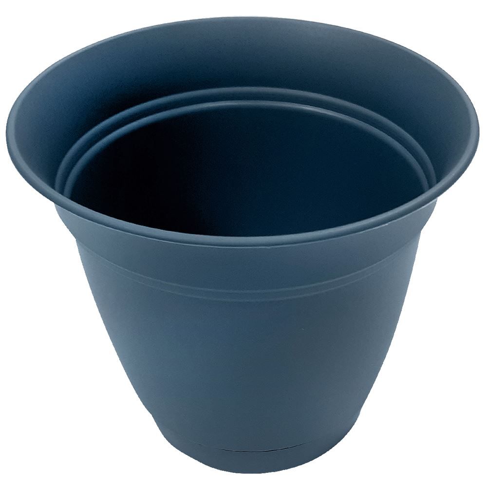 This is a slate blue eclipse planter with attached saucer. It is lightweight and durable making it ideal for outdoor and indoor spaces.