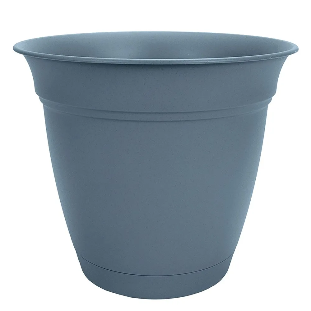 This is a slate blue eclipse planter with attached saucer. It is lightweight and durable making it ideal for outdoor and indoor spaces.