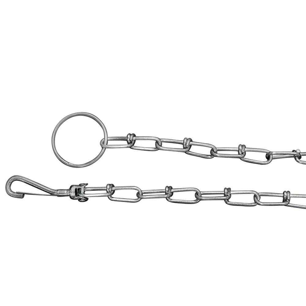 This dog tie out is constructed from a double loop chain. It is a weldless size 2/0 chain that has a working load limit of 255 lbs. This tie out chain comes complete with a swivel spring snap clips, and one ring on the end. This chain is lightweight for dogs so they may easily move around, but is strong enough to help keep them tied. Overall this chain measures 20 feet long and is galvanized.