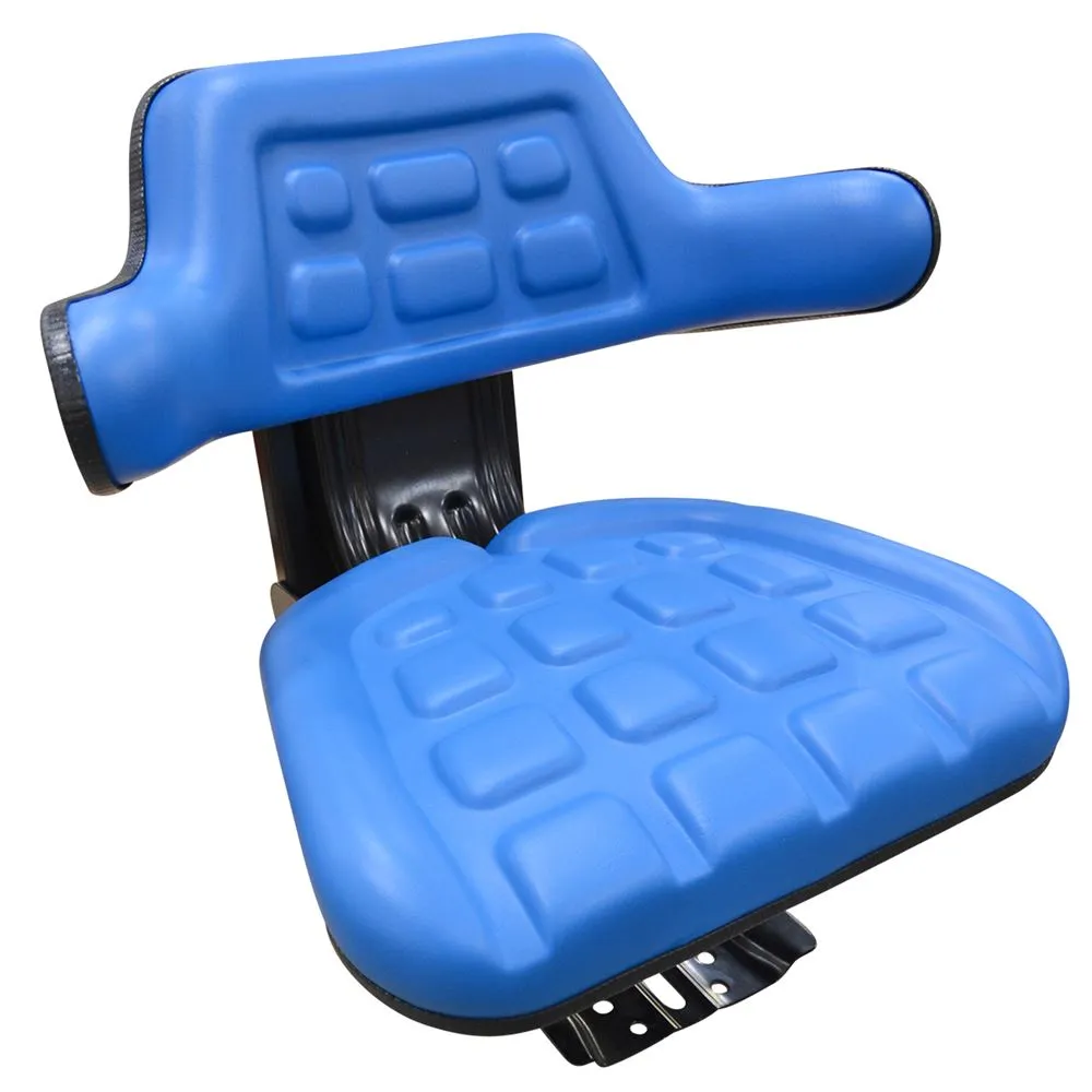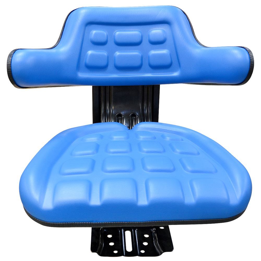 Universal Blue Tractor Seat, This universal tractor seat has a slide suspension, a blue polyurethane seat and back with molded armrests. The overall dimensions of the seat are 19" Length (front to back) x 20 in. Width x 20 in. Height (bottom of mounting plate to the top of the seat back). The bolt hole pattern across the center to center is 3-3/4 in. down it is 4-3/8 in. with three (3) bolts down and across. This tractor seat does not come from the original equipment manufacturer.