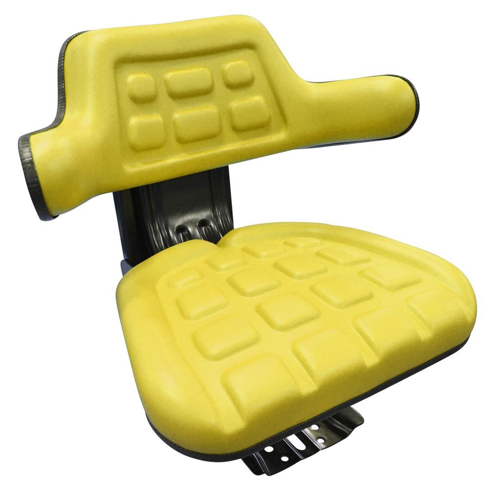 Universal yellow tractor seat, this universal tractor seat has a slide suspension, a yellow polyurethane seat and back with molded armrests. The overall dimensions of the seat are 19 inches in length (front to back) x 20-inches wide x 20-inches in height (bottom of mounting plate to the top of the seat back). The bolt hole pattern across the center to center is 3-3/4 inches down it is 4-3/8 inches with three (3) bolts down and across. This tractor seat does not come from the original equipment manufacturer.