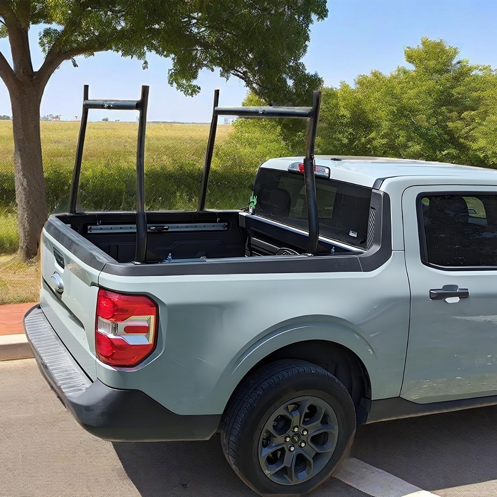 Load cargo such as ladders, pipes, and sporting equipment like canoes onto this utility truck rack. There are 2 racks, a front and a rear, that attach to 16 inch long foot plates, these foot plates install onto the truck bed rails to create the overall rack. This cab rack can support a capacity of 500 lbs., and it keeps your truck bed free for boxy or larger cargo. Each rack is constructed from a 2 inch steel tube, which is coated in a powder finish for protection against the elements. This truck rack fits most truck beds and all of the hardware is included.