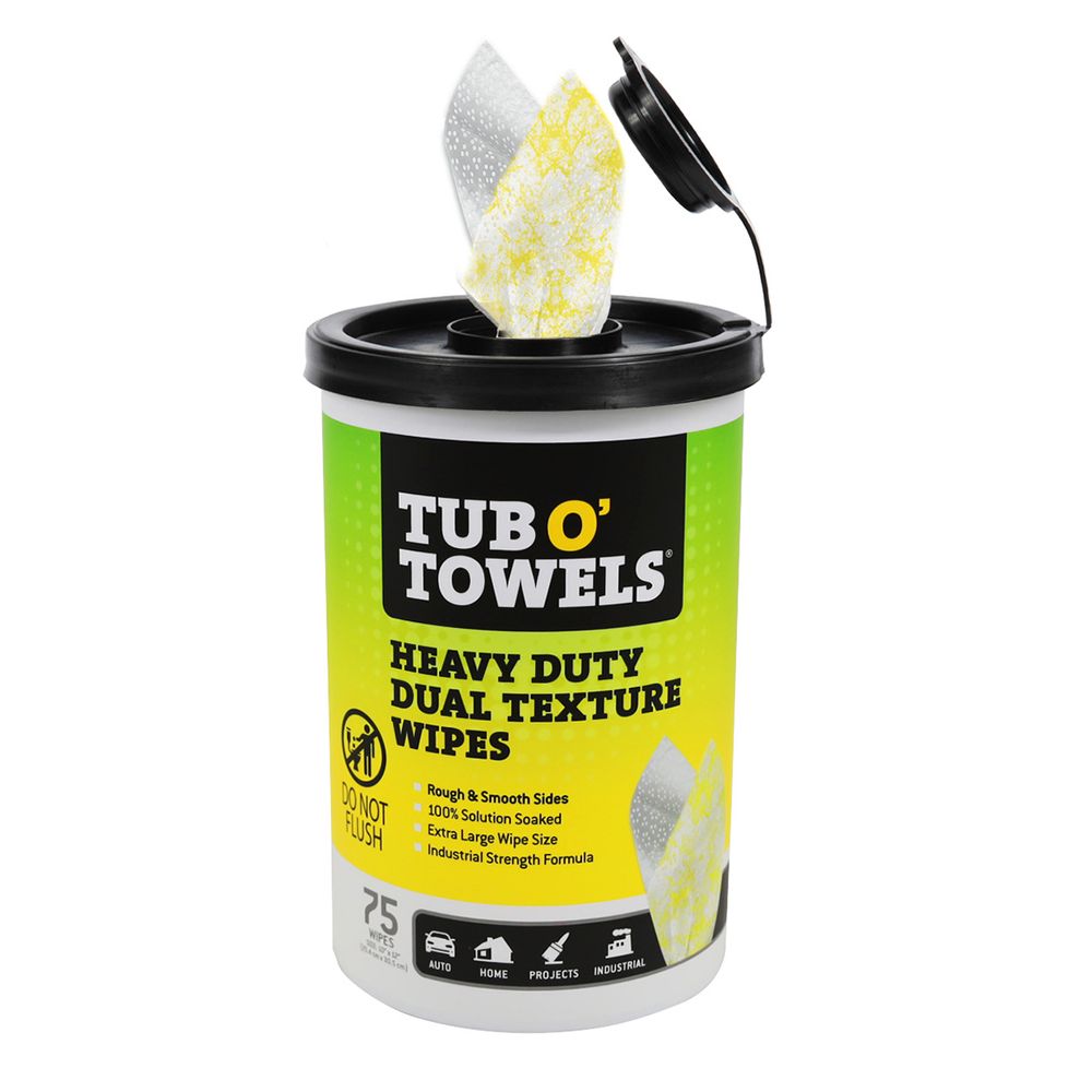 The Bond Buster formula in Tub O' Towels Heavy Duty Dual Texture Cleaning Wipes cuts through grease, oil and stains while the aloe, vitamin E, and lanolin included make the wipes gentle on your hands.