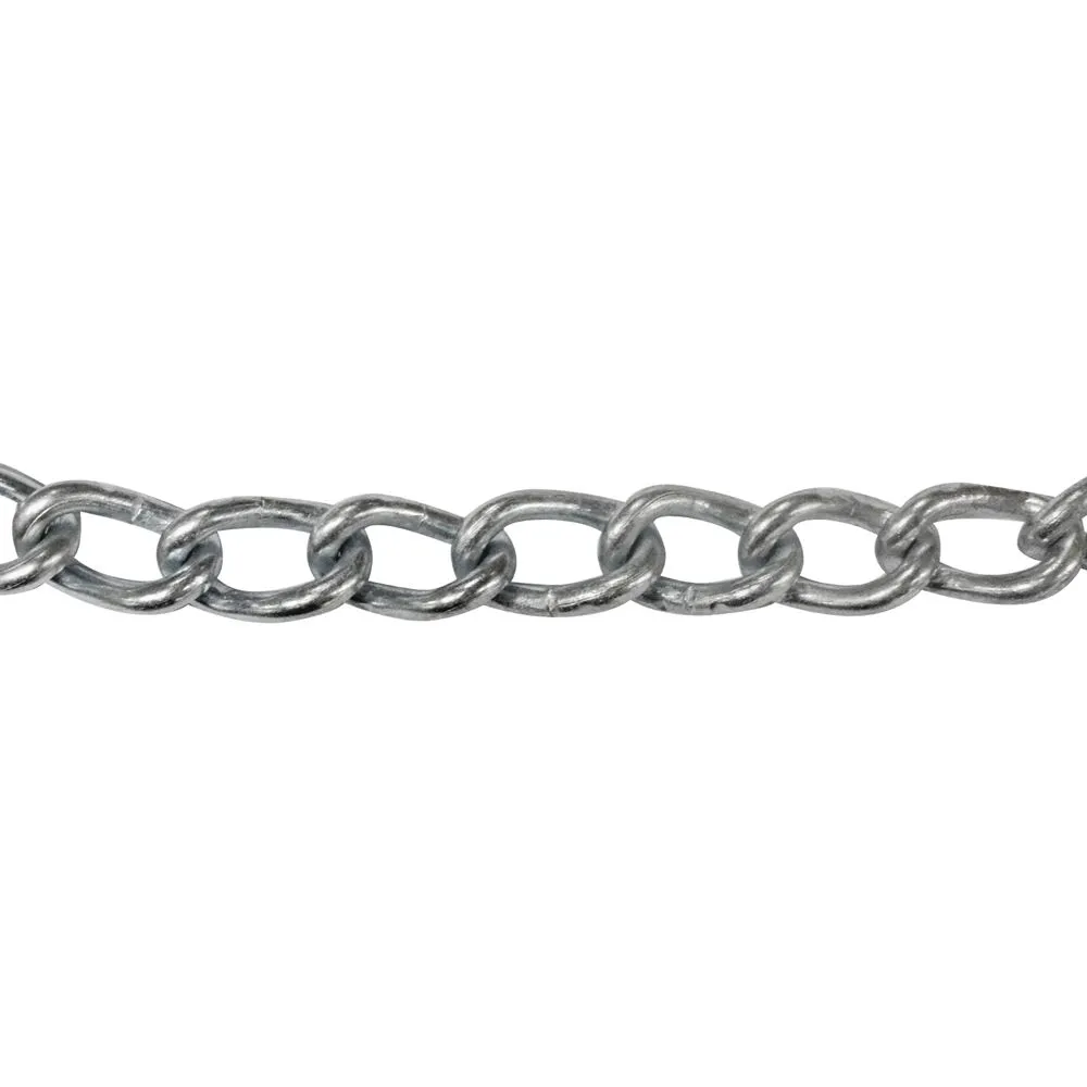 Twist link machine chain is ideal for lighter utility usage. The construction of this chain is carbon welded steel, with a galvanized finish. The size of this chain measures 1/0, the inside diameter of the material measures 0.174 inch, the inside length measures 0.68 inch, and the inside width measures 0.26 inch. This twisted link chain is sold by the foot.