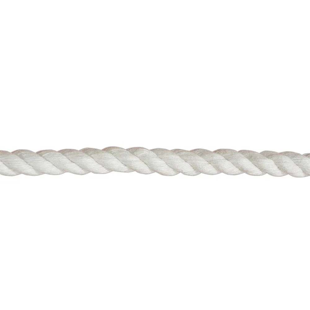 This 3 strand cotton rope features a twisted construction. The smooth surface on this rope makes it easier to handle verses natural ropes with rougher fibers. It is great for knot tying practice or as nautical decor, as this twisted cotton rope is pliable and strong. The maximum working load this rope can support if 352 lbs. and it has breaking strength of 1,762 lbs. This rope is also referred to as cotton plow line.