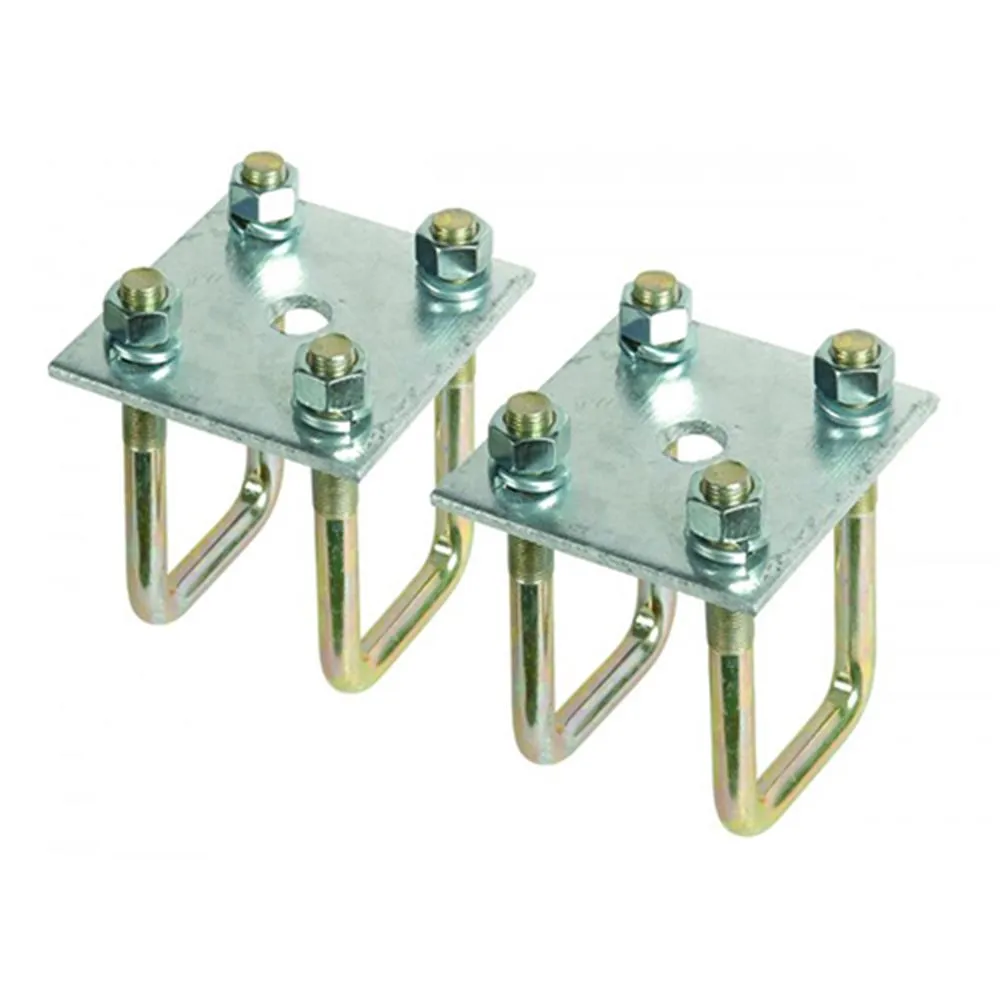 Secure this U-bolt kit to axle underneath trailers or vehicles that need a leaf spring attachment. This kit contains a variety of parts needed to fasten the leaf spring. There are two galvanized tie plates, four U-bolts, and eight nuts with lock washers. The tie plates are square with four holes, one near each corner. The end of each U-bolt is inserted through the holes and secured by a nut and lock washer. These trailer U-bolts and hardware parts are all zinc plated. This kit fits over axles that measure up to 2 inches in diameter.
