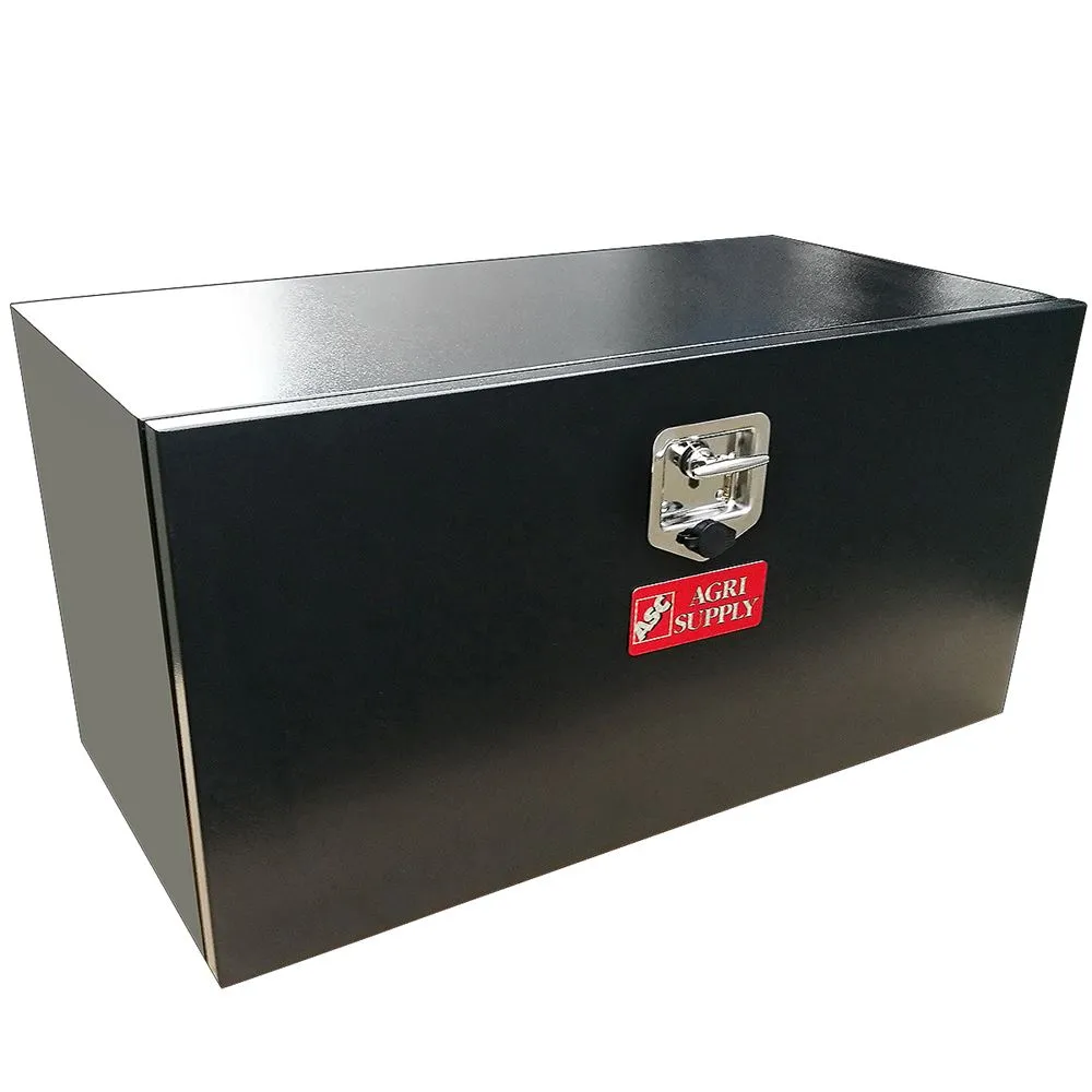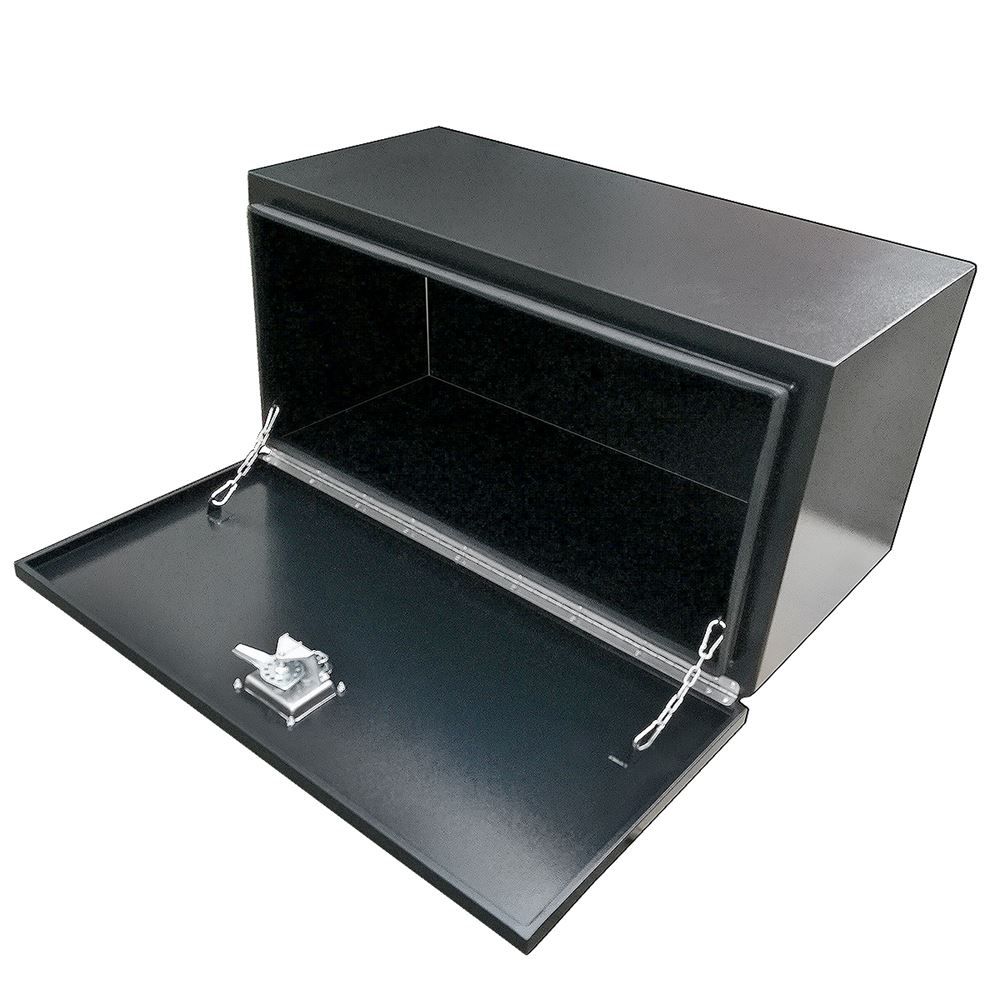 This Steel Underbody Toolbox is 36" L x 18" W x 18" D with rotary action rivet-on locks. It has adjustable striker pins and a black powder coat finish. It comes with a electro-zinc full length hinge pin that has removable stainless steel hinges.
