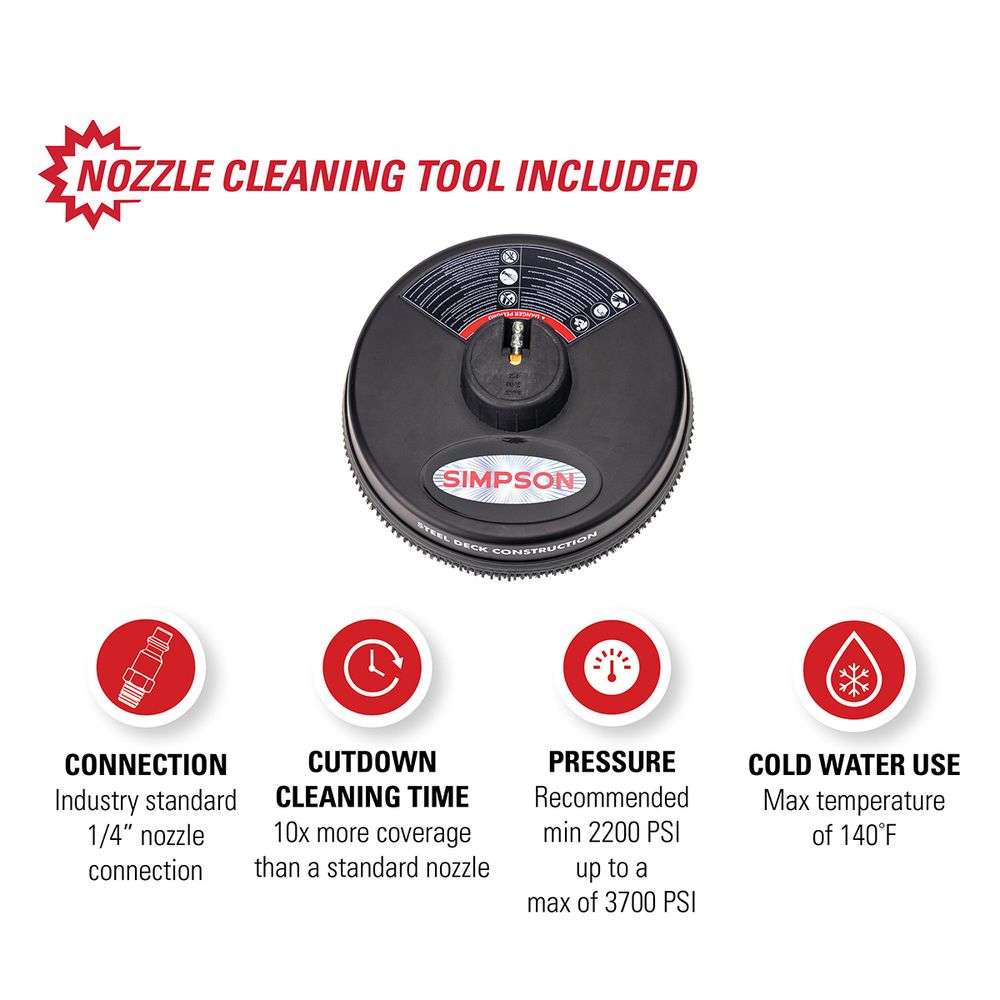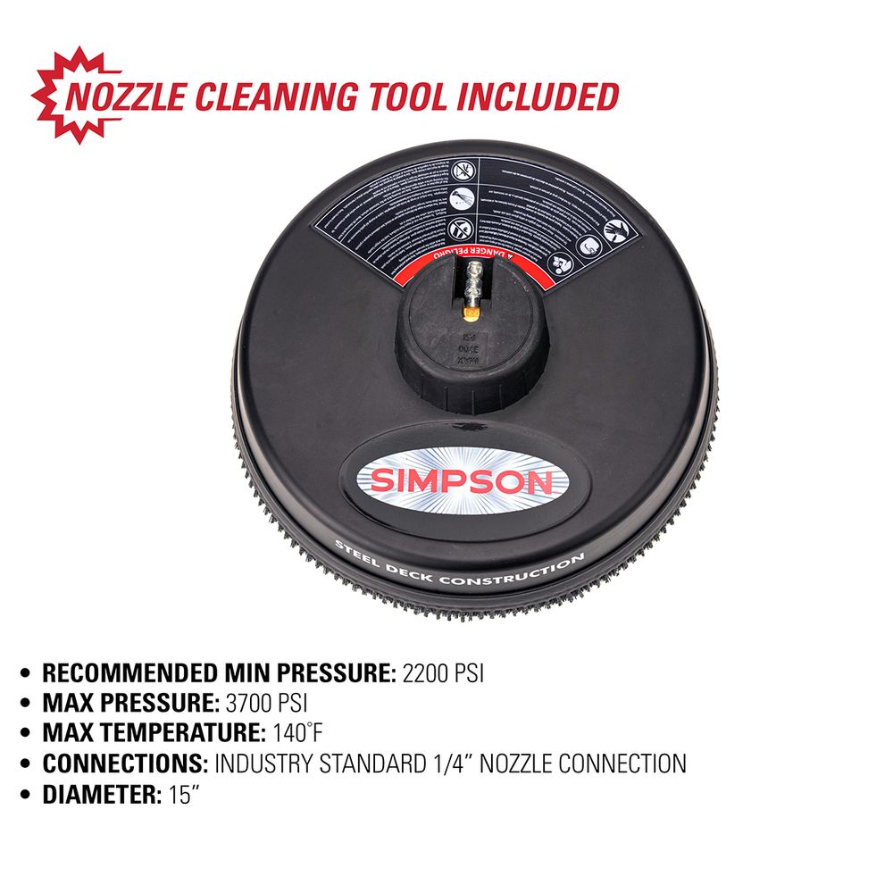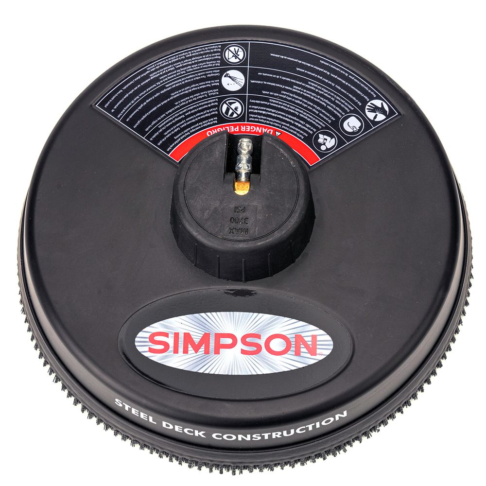 The SIMPSON pressure washer surface cleaner is used for cleaning driveways, patios, decks, sidewalks and more. Its 15″ diameter provides 10X more coverage to clean more efficiently for big jobs. For use with cold water pressure washer with ratings between a recommended minimum 2200 PSI and maximum 3700 PSI, the 80165 surface cleaner has two high-pressure, rotating jets to help remove dirt and grime from surfaces with 10X more coverage than a standard nozzle. This surface scrubber features high-quality steel attachments and utilizes high-pressure rotating jets for a thorough clean that is fast and streak-free. The powder coated steel shroud prevents overspray, allowing the user and surrounding areas to stay dryer when compared to a pressure washing wand.