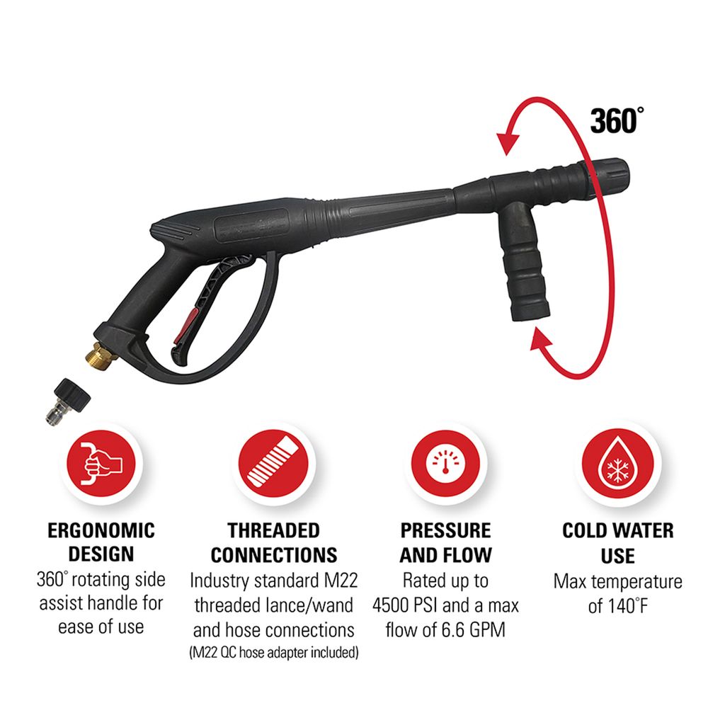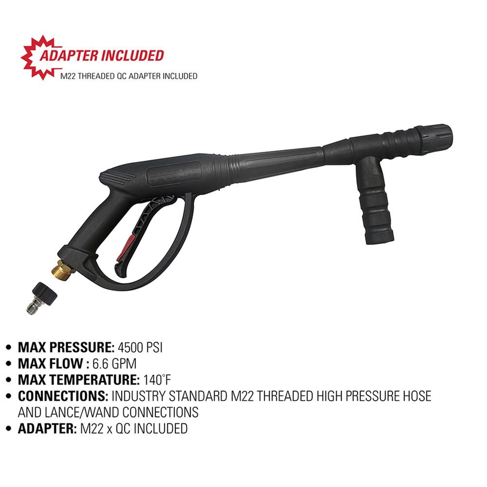 - Can be used as a replacement or an upgrade of an existing spray gun for most pressure washers up to 4500 PSI, 6.6 GPM