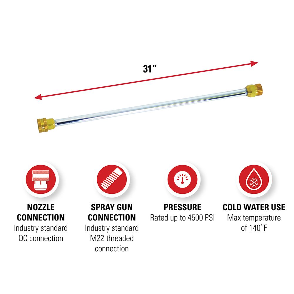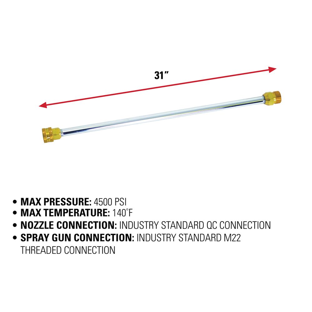 SIMPSONĀ® offers a variety of extension wands to suit your needs. The universal pressure washer wand 80479 is 31-inches in length; it features an industry standard quick connect nozzle connection as well as an industry standard M22 threaded spray gun connection. This wand/lance is compatible with most pressure washers rated up to 4500 PSI. The extension wand is high-quality Simpson construction, ensuring great performance for any pressure washing task. Please note this extension is only for cold water use.