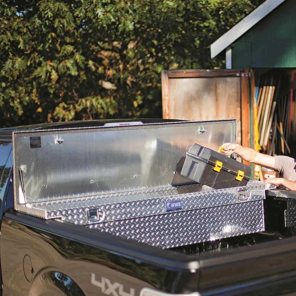Easily keep fishing, camping or work gear in this aluminum truck toolbox. The lid is designed with a special foam filling that prevents it from bending or warping over time. It opens to a full 90 degrees, allowing larger bulky items to fit inside. It even has self-closing struts that allow you to use the toolbox when your hands are full. This truck box has MicroSeal® stripping that keeps dirt and moisture out. The interior contains 2 tool trays and a sliding tray with 3 smaller compartments for organization.