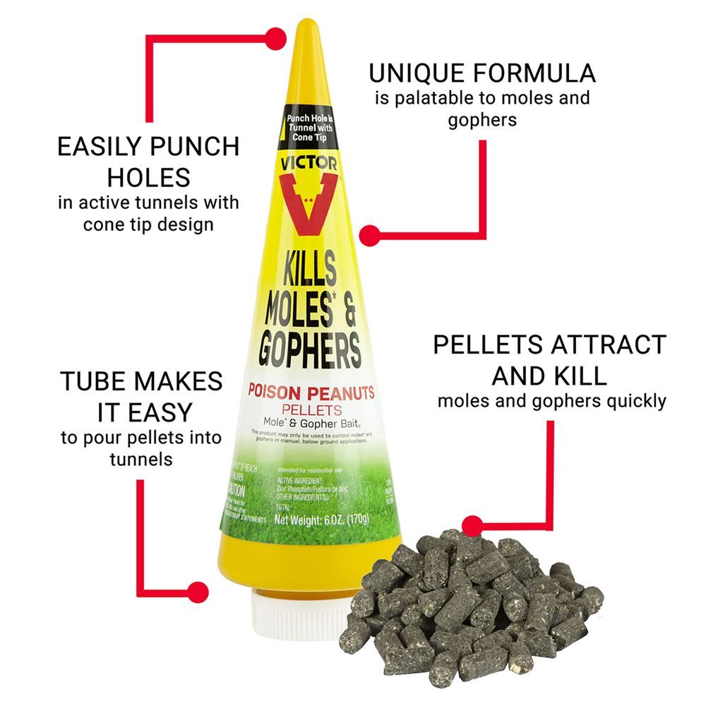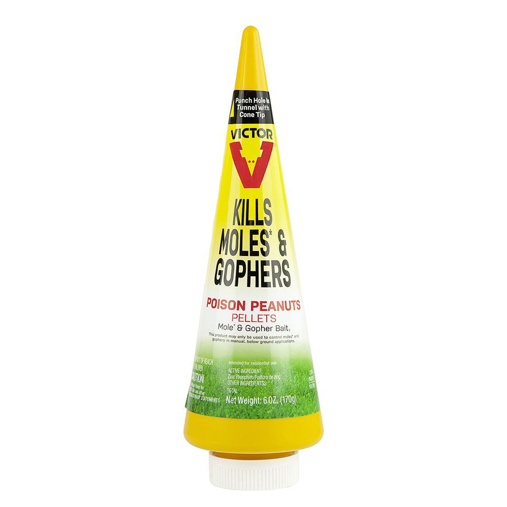 Narrow down which tunnels and underground runways are actively used, prior to applying these poison peanuts. These mole poison peanuts fits into this 6 oz. cone shaped dispensary bottle. The tip creates small holes into the earth, dropping these pellet like peanuts into the active tunnels. Formulated from the active ingredient Zinc Phosphide, moles and gophers will quickly be terminated after ingestion. Store these poison peanuts in a safe location away from children and pets.