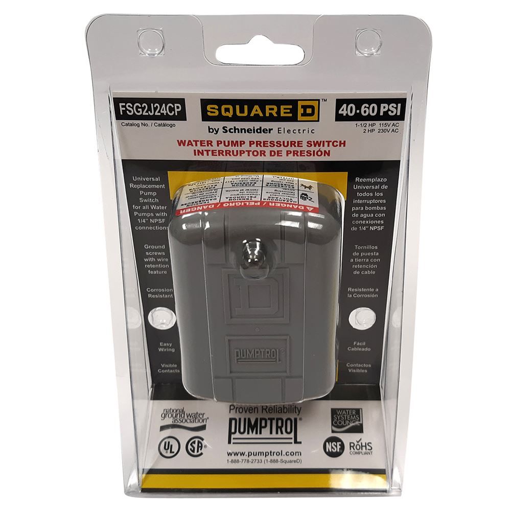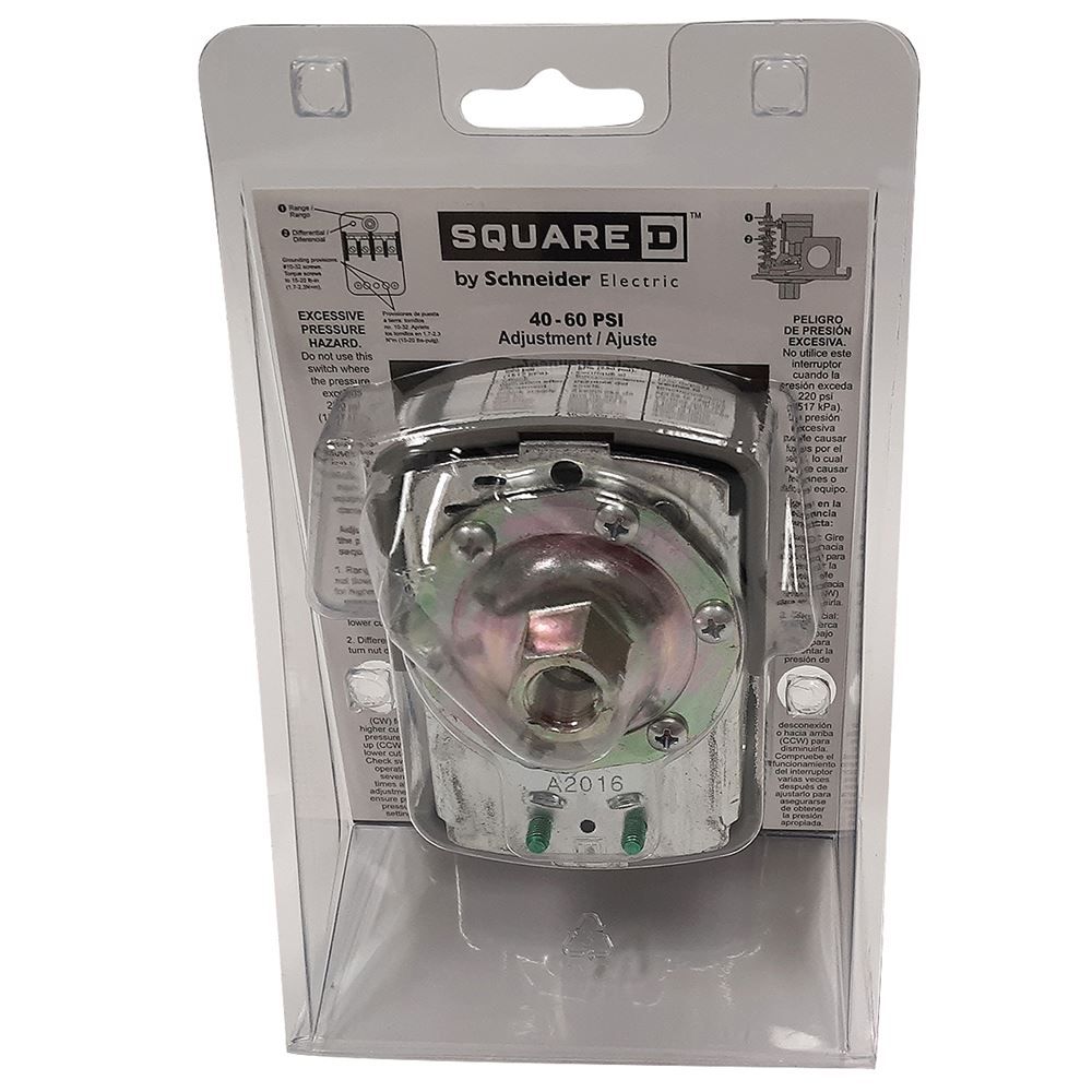 Square D water pump electric pressure switch works with jet pumps, submersible pumps, and reciprocating pumps. The 40-60 psi pressure switch features standard action contacts and has a 1/4" NPTF connection.