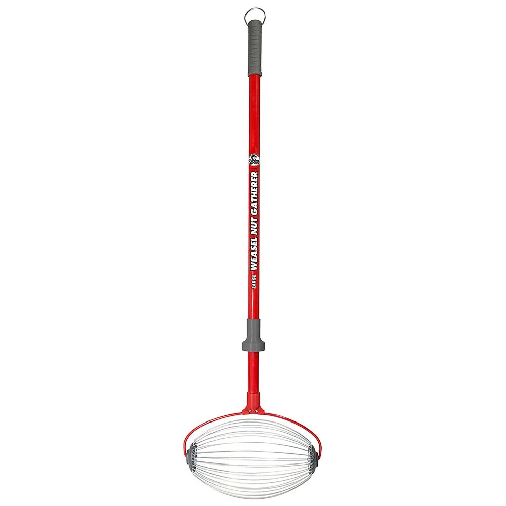 This Garden Weasel large nut gatherer can work anywhere. It easily picks up magnolia seeds, walnuts, butternuts, hickory nuts, chestnuts, gum balls, and small fruit. This Garden Weasel helps eliminate the bending and stooping reduces strain of your back. The unloader basket is made with durable steel tines and has a comfortable grip handle.