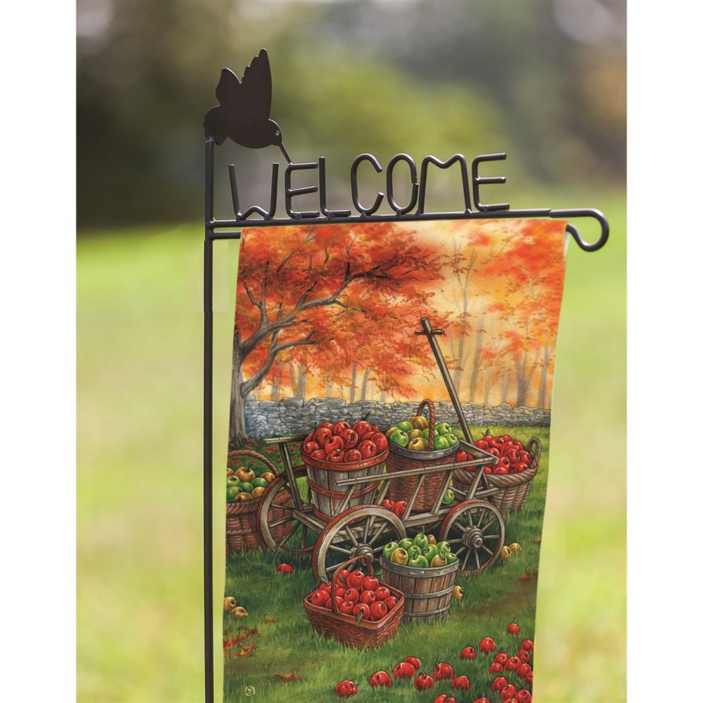 Bring seasonal whimsy to your garden with garden flags. This wrought iron garden flag stand is constructed with a step-in spike to easily push into the soil. The top of the garden flag stand is curled to help your flag stay secure on windy days.