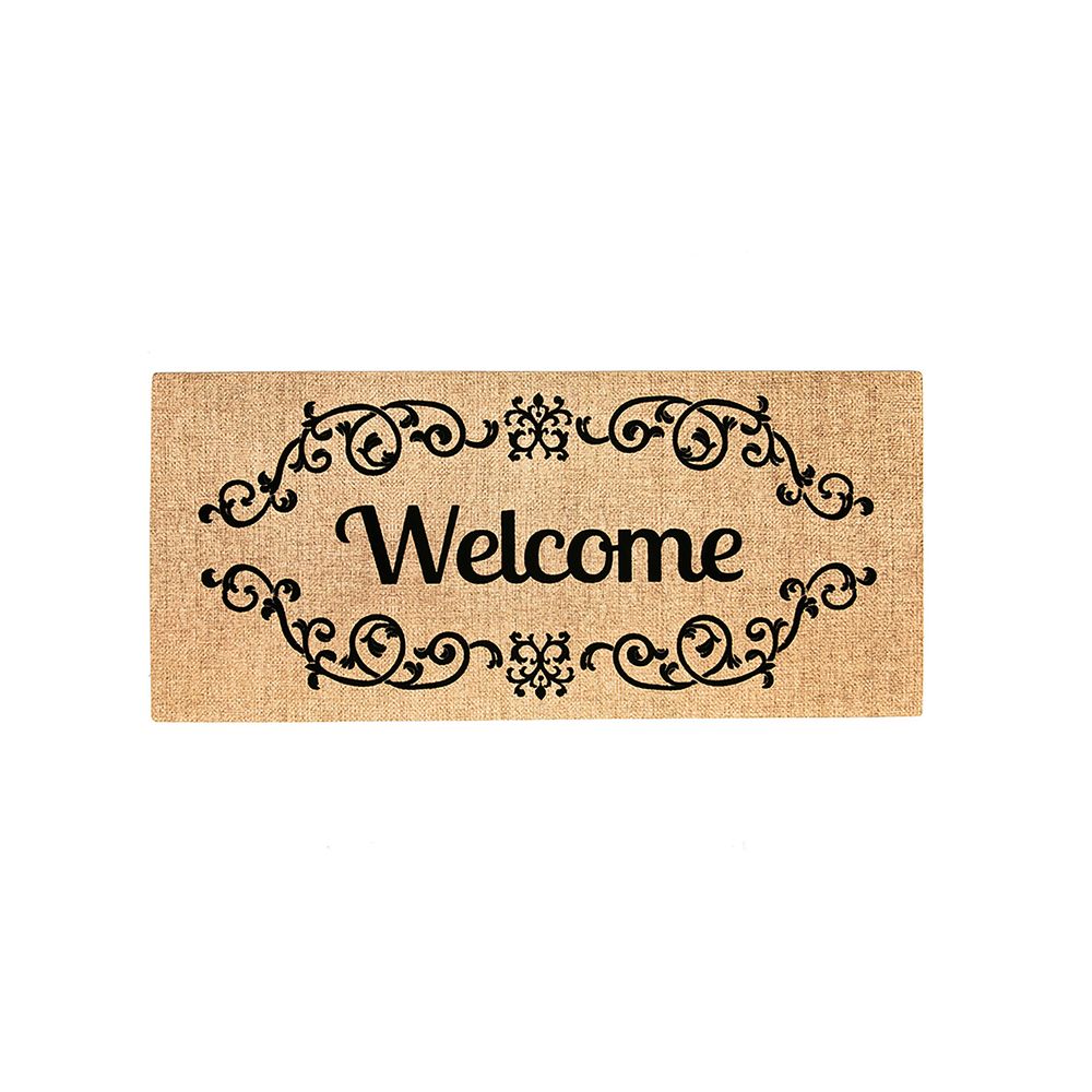 Embrace classic elegance at your doorstep. This Sassafras switch mat showcases a traditional design, featuring a graceful swirl border framing a warm "Welcome" message. Made from durable, heat-sublimated polyester with a non-slip rubber backing, it's the perfect insert for Evergreen's switch doormat bases.