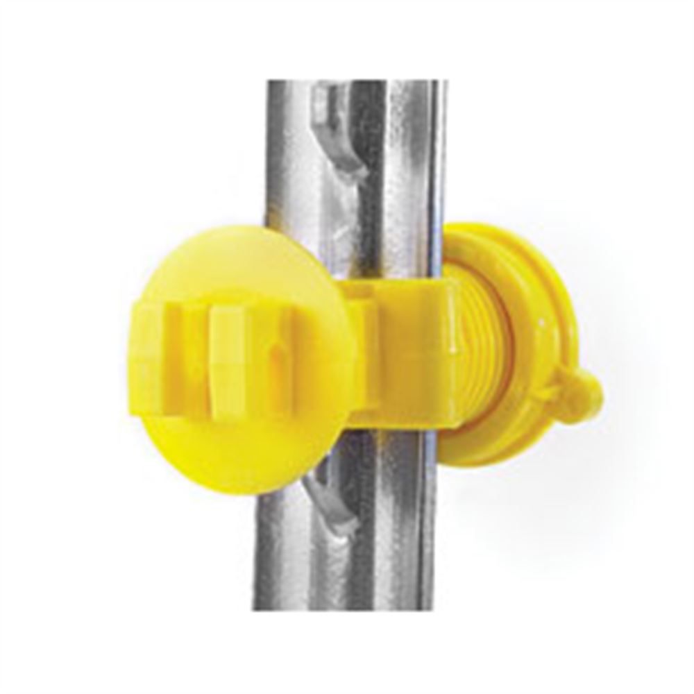 This Screw-Tight T Post Insulator fits all T Posts, with or without studs. It also can be adjusted to fit 3/4" diameter sucker rods and 1 1/8" wide U posts. It is yellow and there are 25 in a bag.