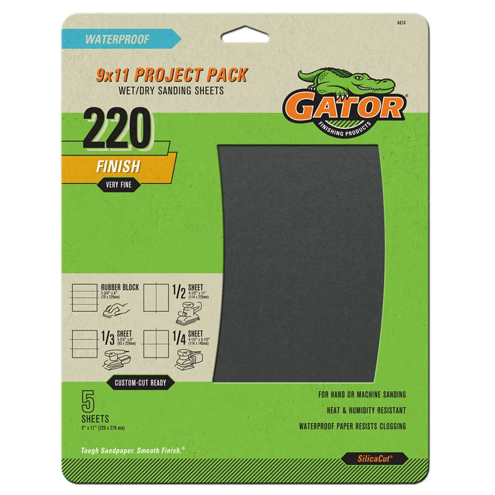 This Gator Wet Dry Sand Paper (9" x 11" Sheet Size) is for hand or machine sanding. It is 220-grit very fine multi-use sandpaper and is best for sanding wet and dry applications on metal and finishing between coats.