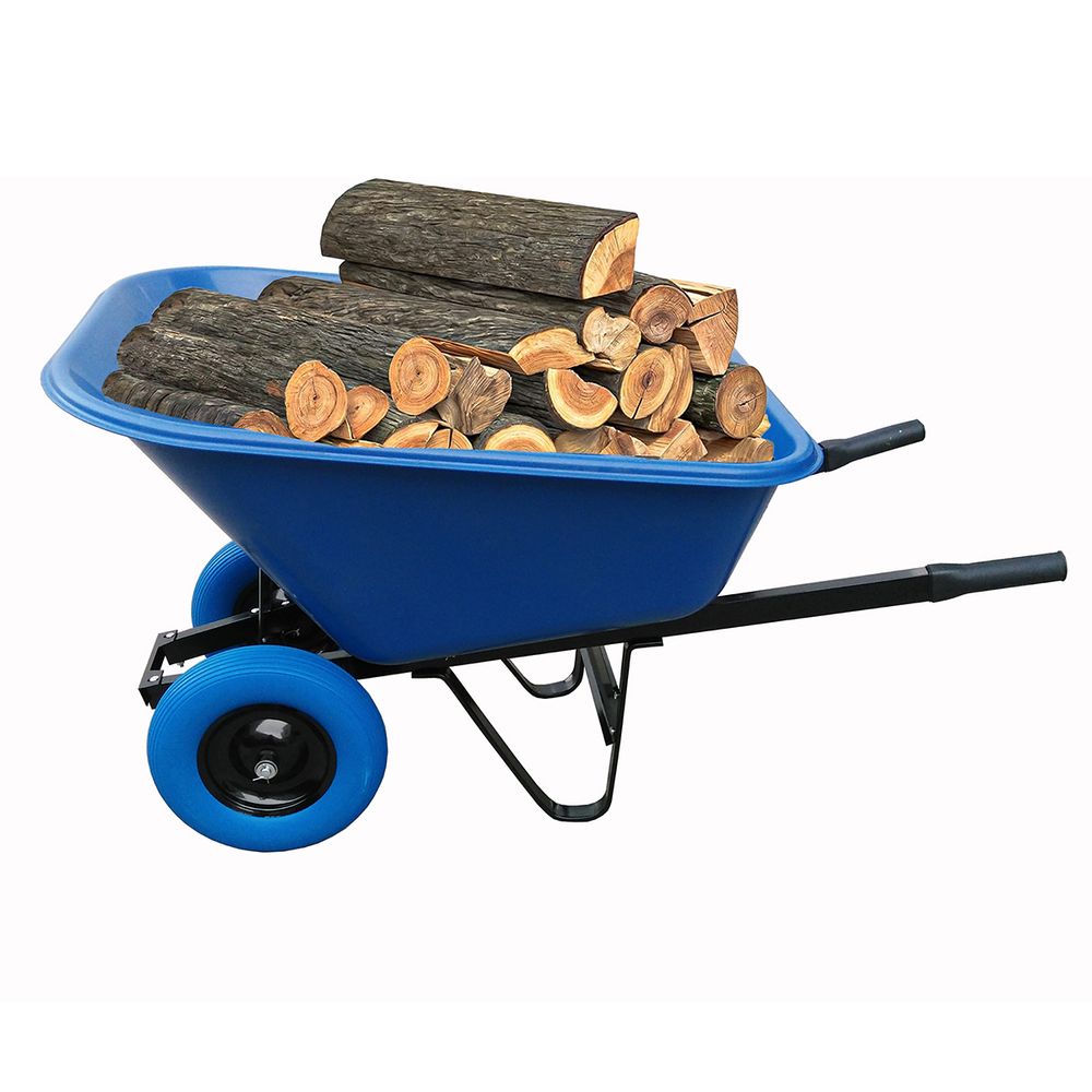 This blue 10 cubic foot wheelbarrow is the perfect size for lots of jobs around the yard. This wheelbarrow has 2 front 16" wheels making it easier to move loads over areas that are unlevel or tough terrains.