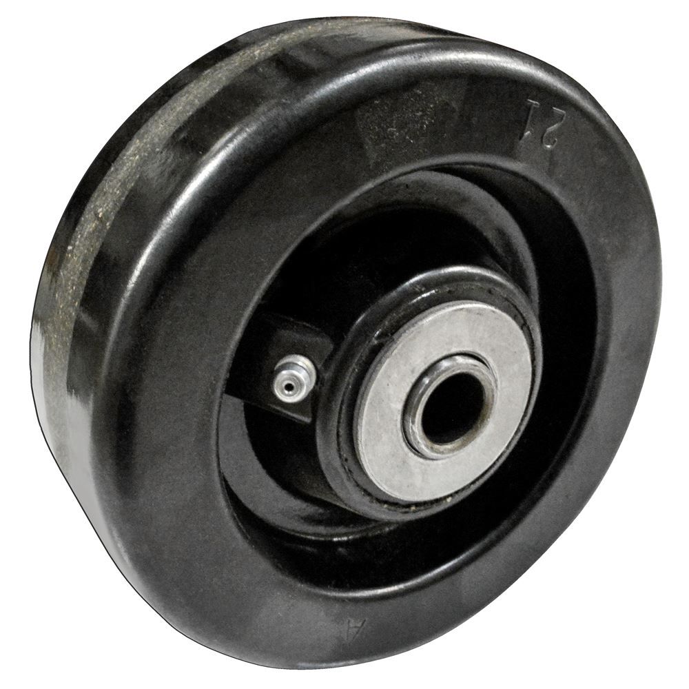 This is a replacement DeCloet part number 18322 box barn wheel with bushing. This wheel has an overall diameter of 5" and an inside diameter of 1/2 inch.