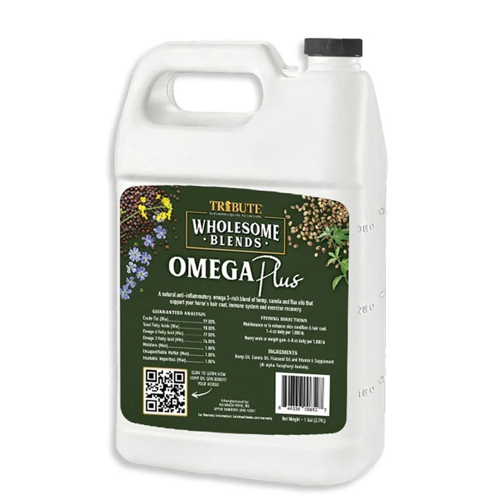 Kalmbach® Tribute® Wholesome Blends® Omega Plus is a natural anti-inflammatory 3-rich blend of hemp, canola, and flax oils that support horses' coats, body condition, immune health, and exercise recovery.