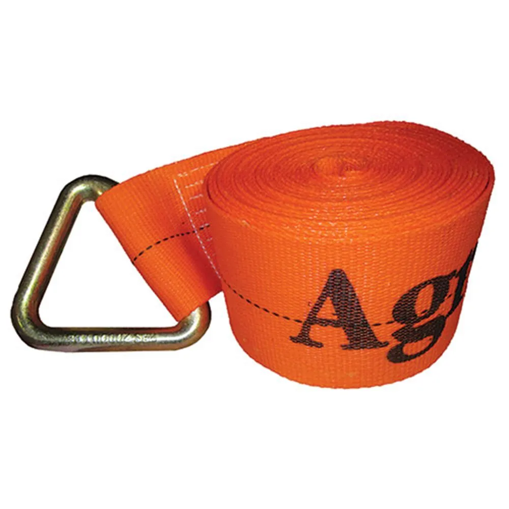 This delta ring, also known as a triangle ring, winch strap can hold up to 5,400 pounds. This strap is 27 ft. long and has been treated to handle weathering and heavy cargo.