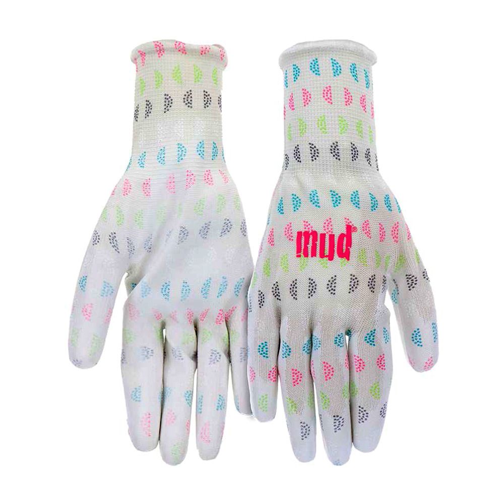 This pair of Mud® Polyester seamless knit women's garden gloves with clear polyurethane dipped palm. Form-fitting to reduce hand fatigue with a lightweight design that provides protection when gardening.
