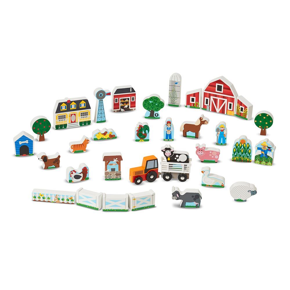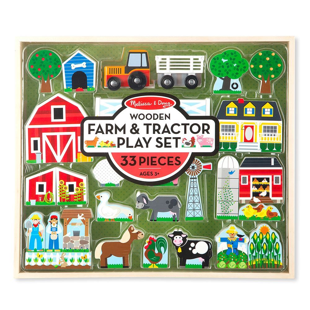 This wooden farm & tractor play set is a 33 piece set. It includes a tractor and a flat bed trailer. The pieces are decorated on one side and are great for stacking, sorting, counting, and building.