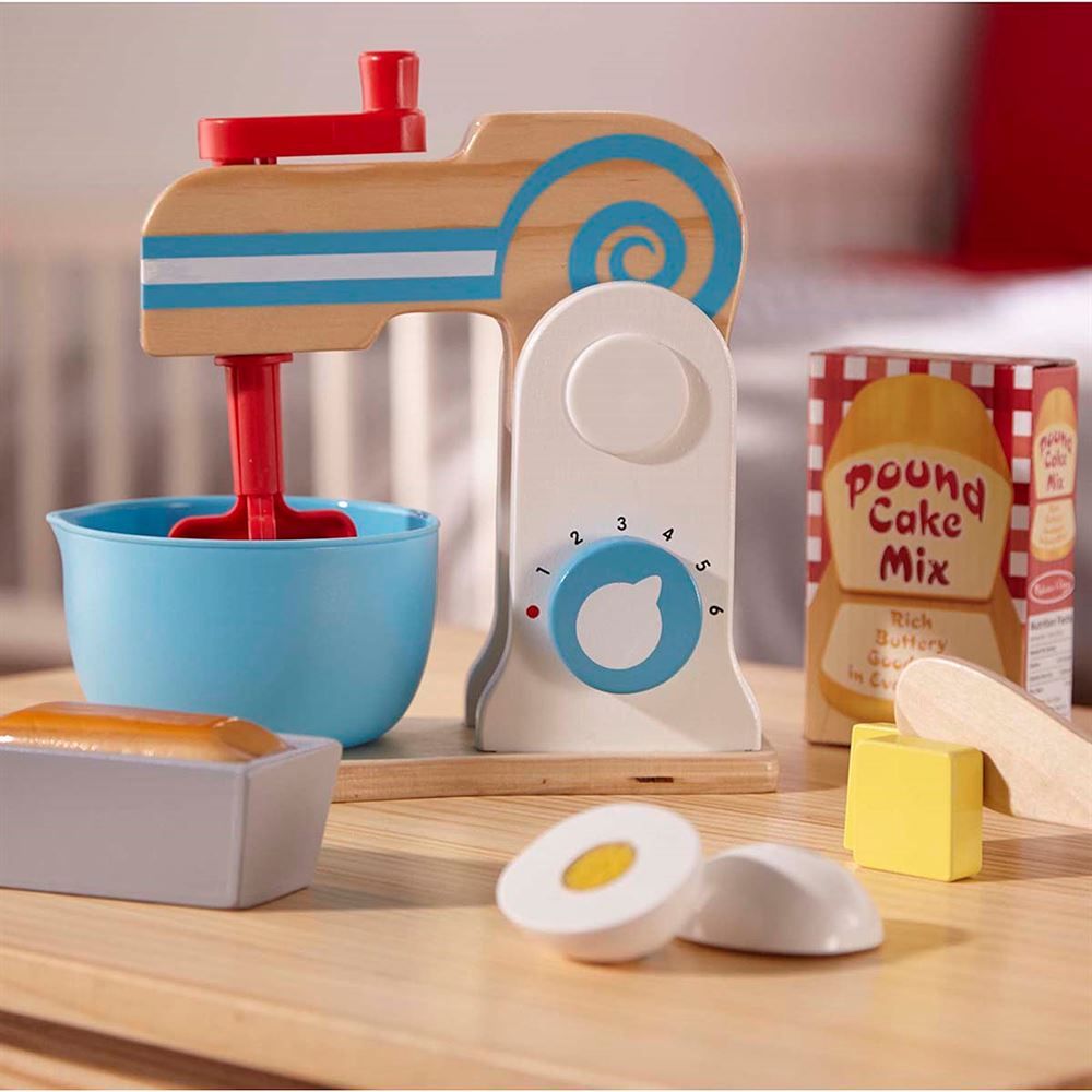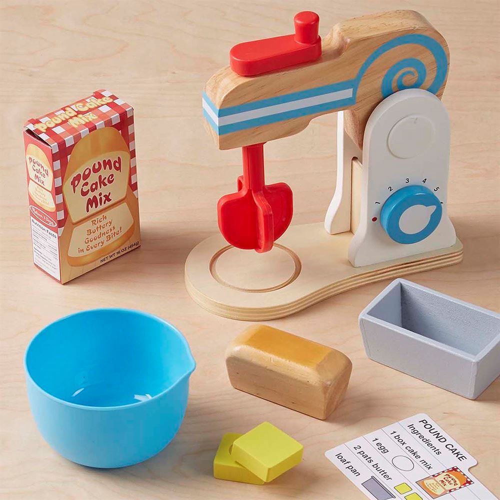 - Includes a mixer, bowl, sliceable wooden egg and butter, loaf, cake pan, pretend cake mix box, cake pan, wooden knife, and recipe card