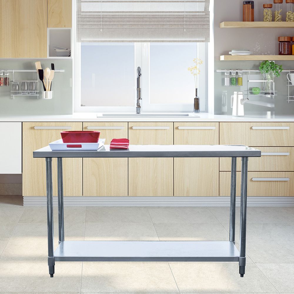 Measuring 4 ft. wide, this NSF® approved stainless steel table is easy to clean, making it a great choice for any craft. This table can handle up to 3,000 lbs. and has an additional undershelf for storage.